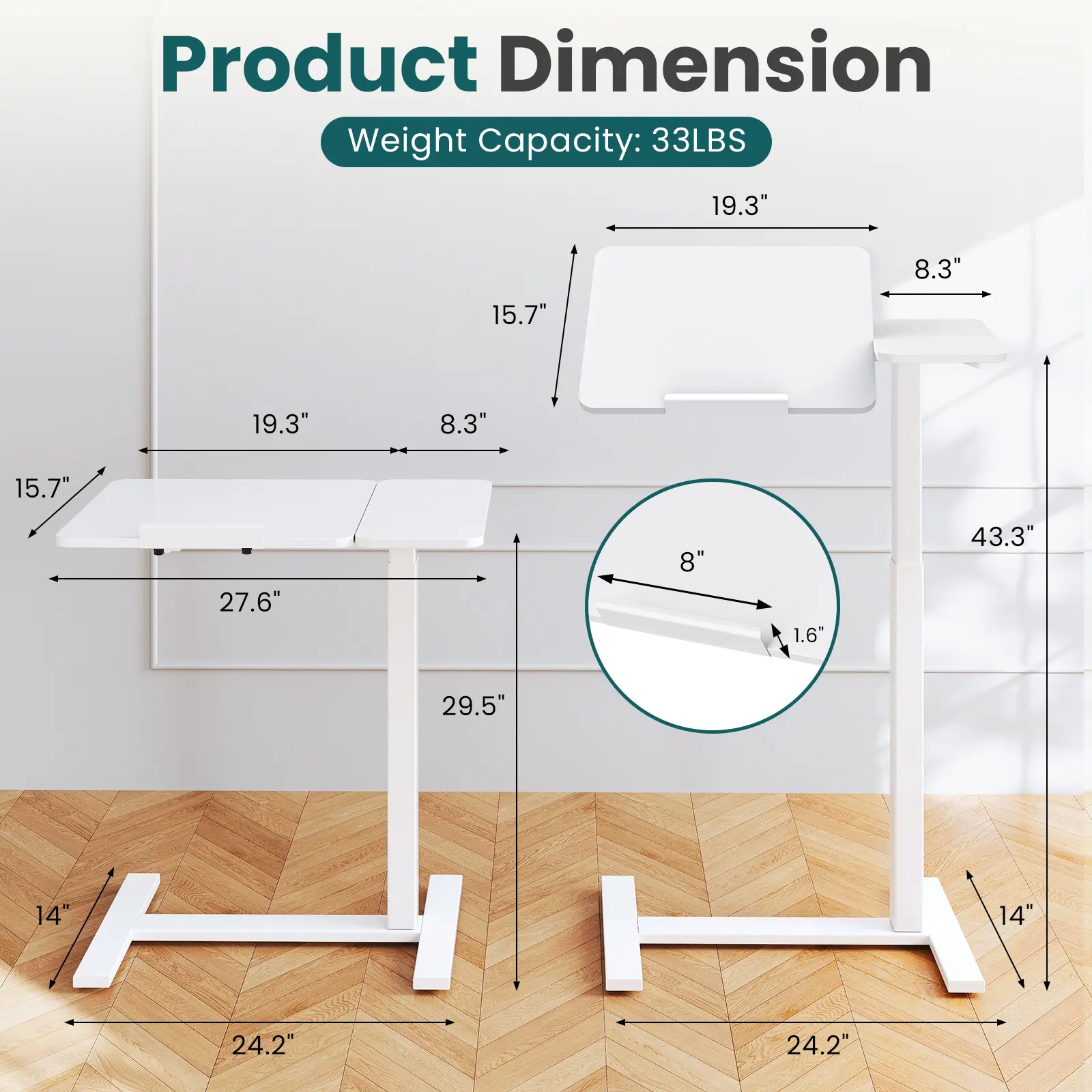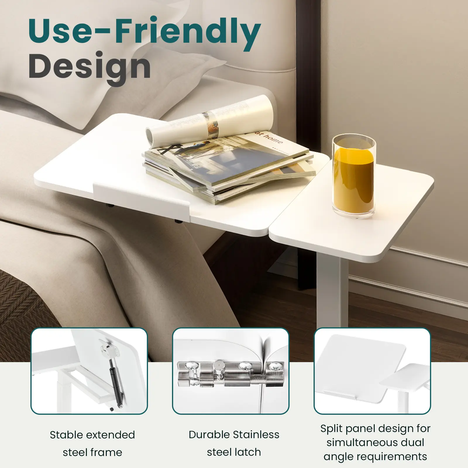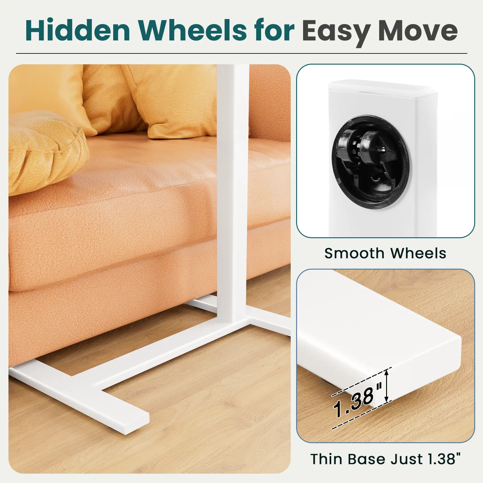 Great table! Very sturdy, nice size, room for laptop and the side can be used for a drink or writing notepad. Easy table-tilt feature with handle. Same for raising the table. Also includes a locking feature under the table tilt so it stays in place. Wheels are hidden and easily rolls around. The table has a nice laminated topping and underside, which protects the table. Overall a great product for the price. Highly recommend.