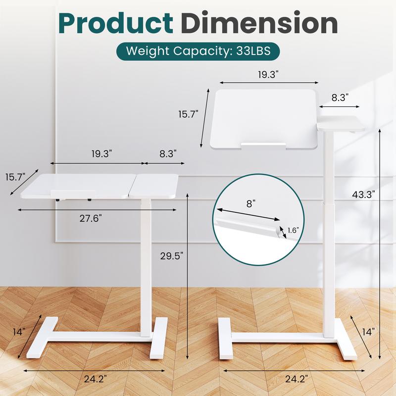 ·Height Adjustable: Overbed bedside table has height adjustable feature that allows the gas spring system to easily adjust the height of the desk from 29.5 inches to 43.3 inches with the push of a button on the side of the desk, providing a fast and smooth lifting and lowering experience. Adjustable rolling overbed bedside table with wheels for a more ergonomic fit, providing you with a more comfortable experience