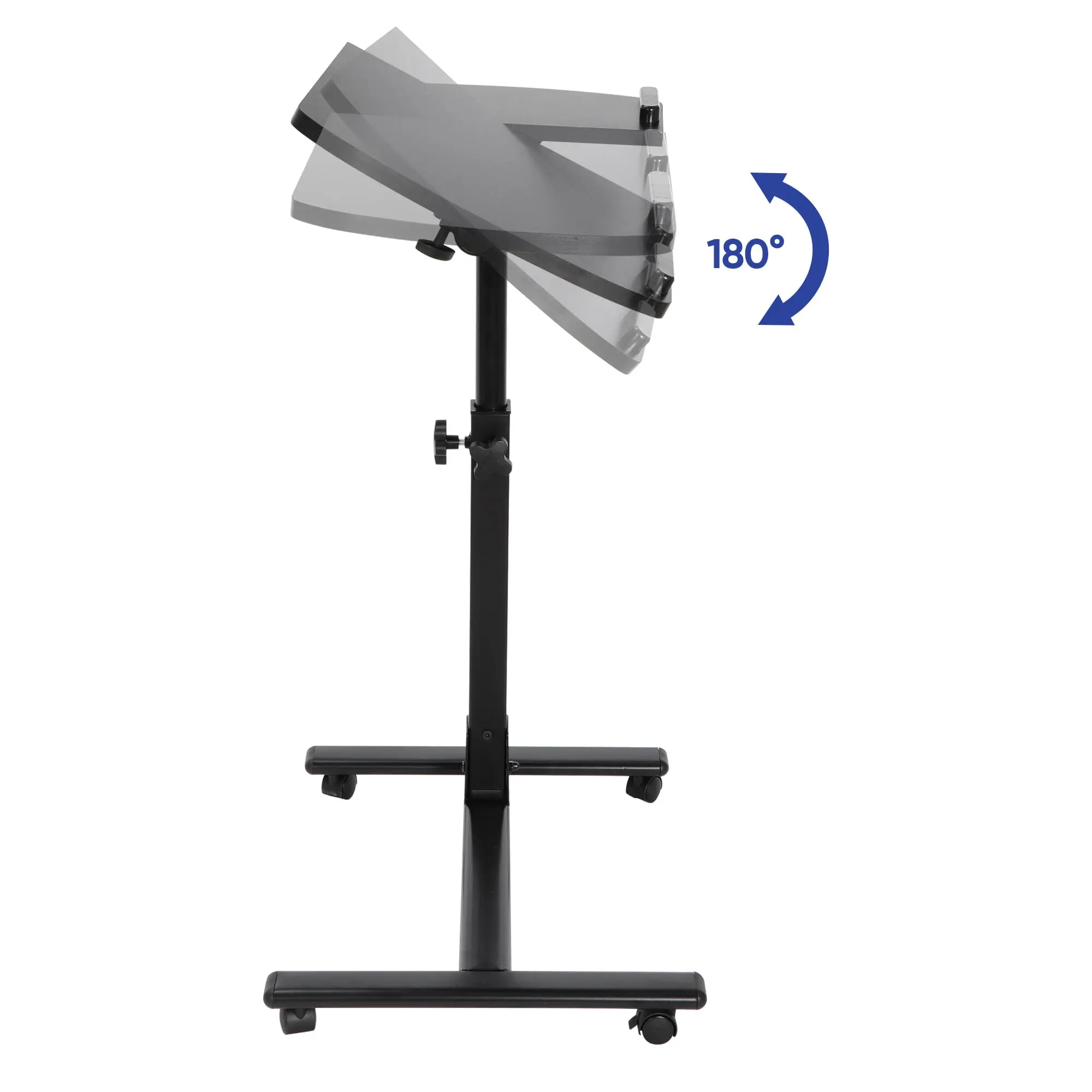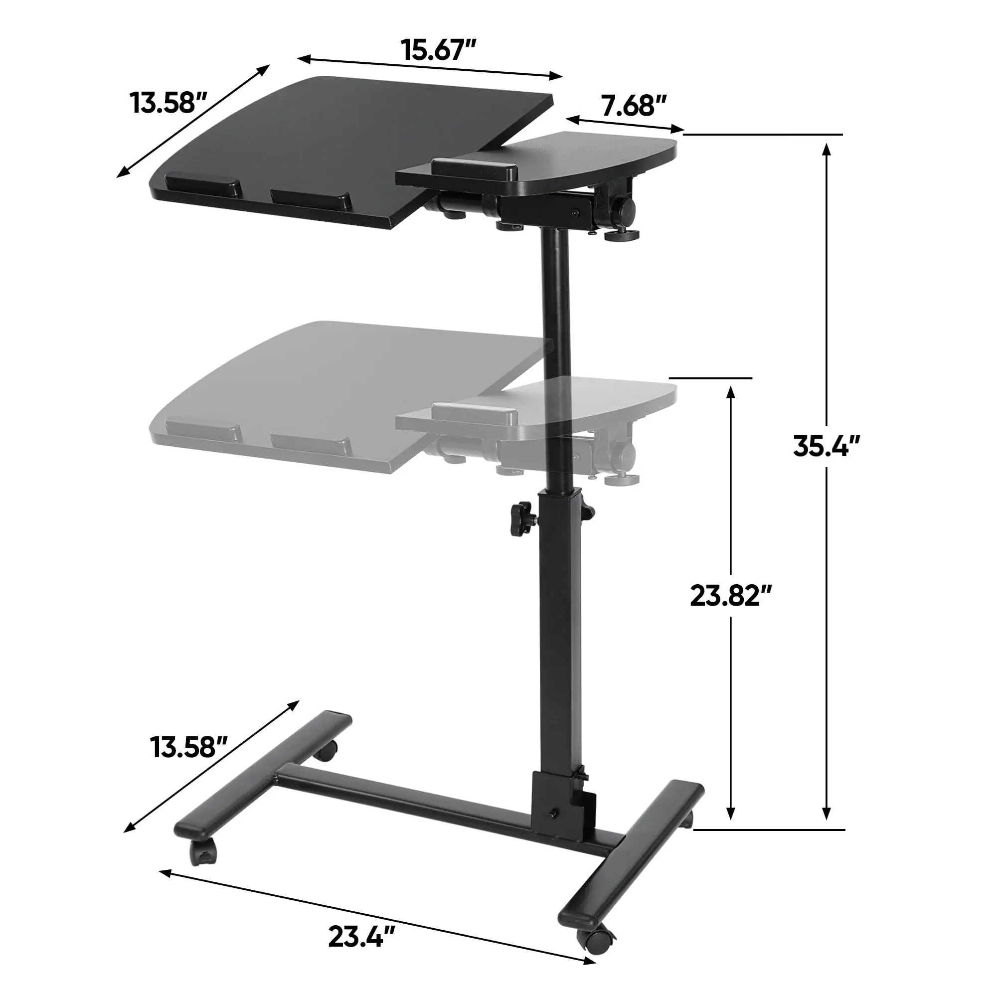 This unique and elegant desk combines the sophistication of steel and the warmth of wood, stylish and modern yet so simple. The sturdier frame remains stable at any height, 24"--35.5", eliminating wobble. The tilting mechanism locks into place once set.360° Swivel and 180° Rotatable. Safety edge-stopper to prevent objects from sliding off when the panel is tilted. The ergonomic table can also be used for a TV dinner or breakfast tray, sound equipment, projector, notebook standing desks, book tray, writing desk, tablet holder, and other than laptop stand. Thanks for choosing our products. Zen Style Rolling Table Overbed Bedside Desk Laptop Cart Stand. The ergonomic table can also be used for a TV dinner or breakfast tray, sound equipment, projector, notebook standing desks, book tray, writing desk, tablet holder, and other than laptop stand.