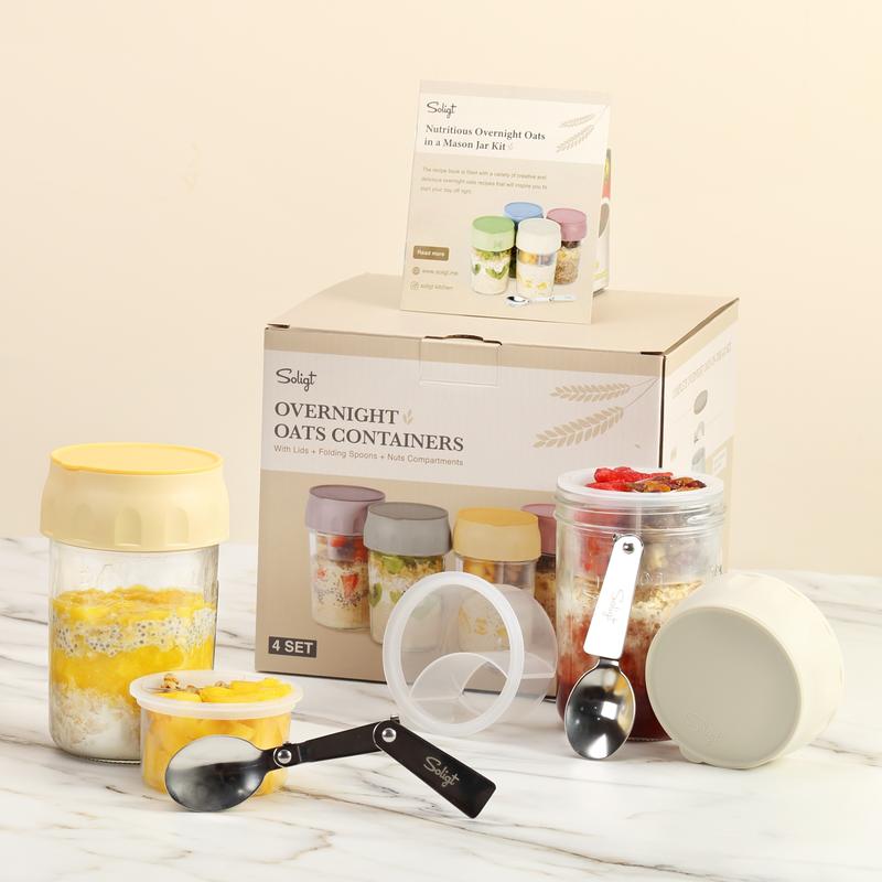 Soligt Overnight Oats Containers with Lids, Folding Spoons, and Divided Compartments for Fruit & Nuts
