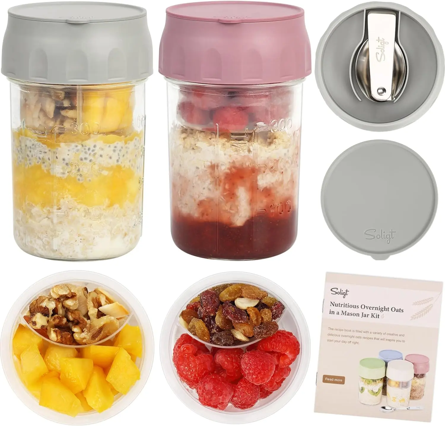 ·UNIQUE ON-THE-GO STRUCTURE: To make the overnight oats jars set more portable and compact, Soligt adopts the design that combing the space of the folding spoon and mason jar lid, just take and put back the spoon into the lid every use.
