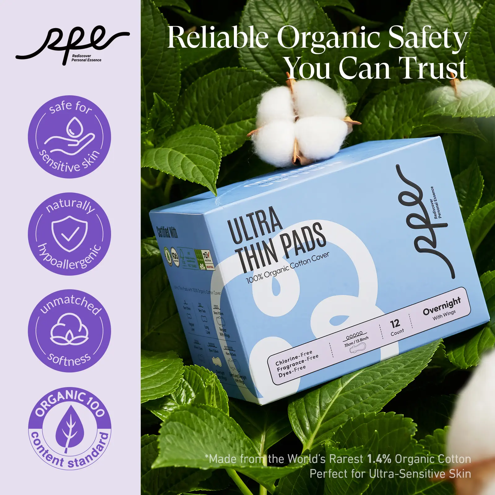 Completely biodegradable and plastic-free, RPE pads are ideal for eco-conscious users. Focus on a zero-waste lifestyle. Rediscover personal essence with RPE Life Overnight Pads.
