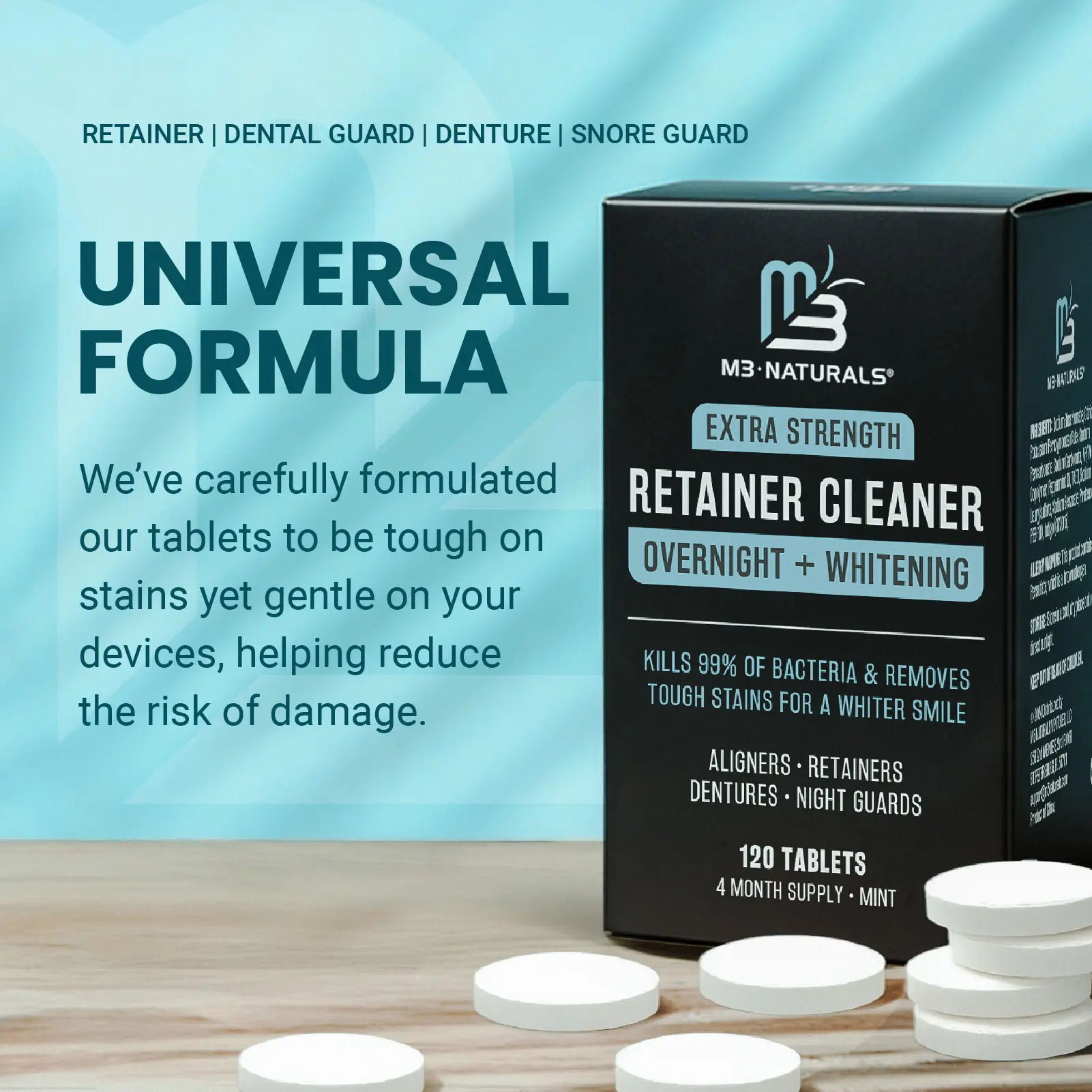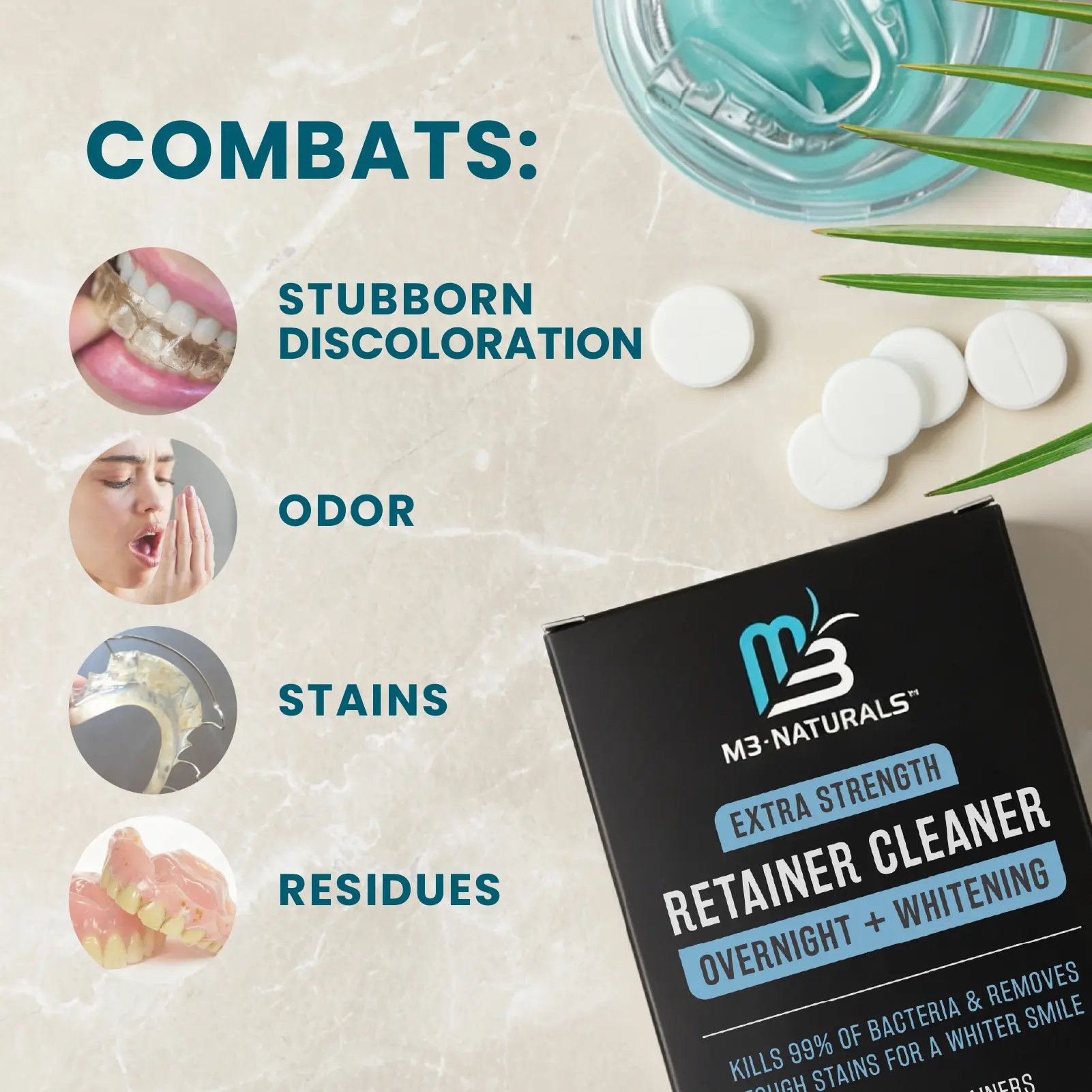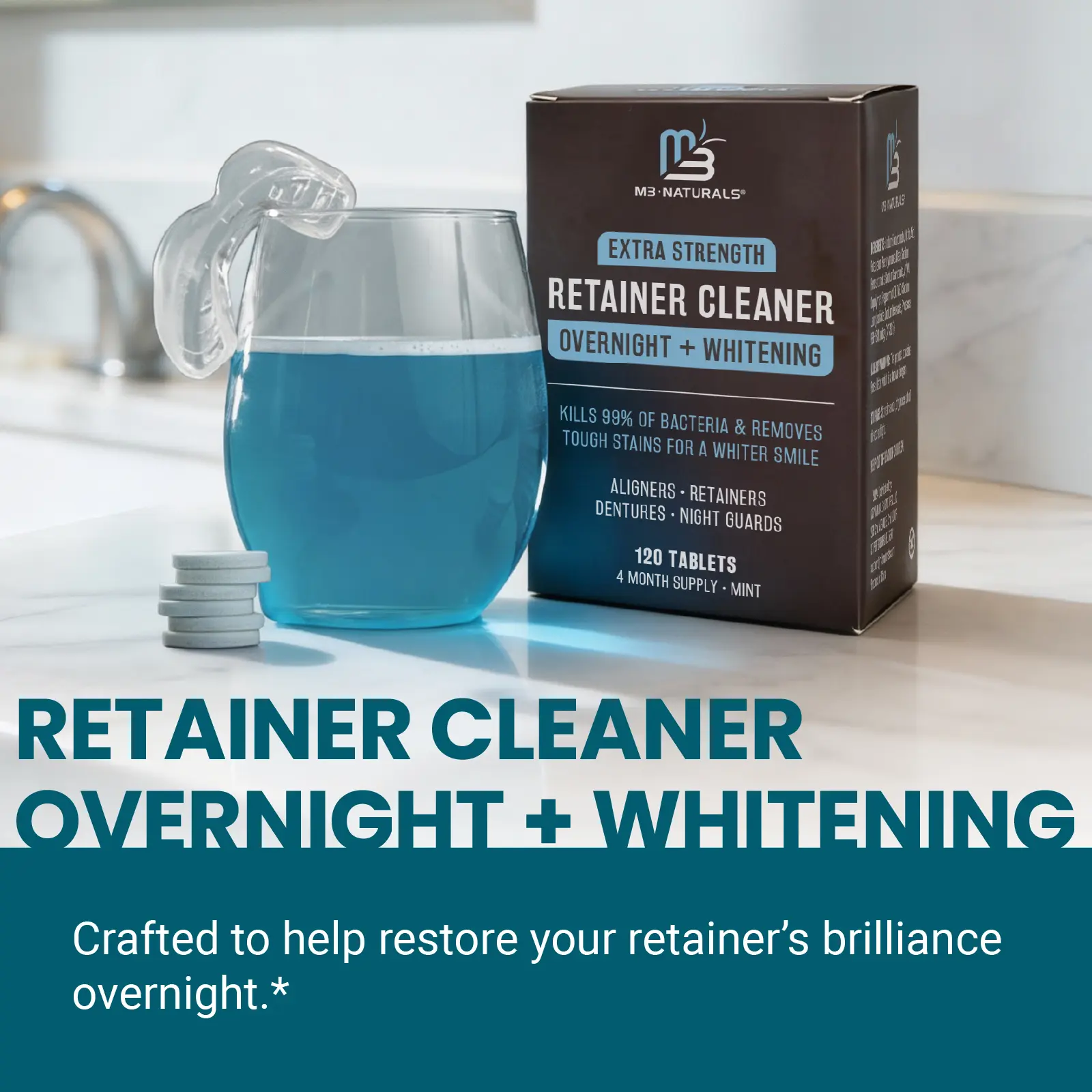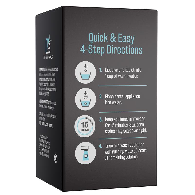 Reviewing Overnight + Whitening Retainer Cleaner | FSA HSA Approved | Remove Stains, Discoloration, and Plaque | 4 Month Supply | Denture Cleanser with Whitening Boost by M3 NaturalsThis overnight retainer cleaner works very well. I use it with my sonic dental appliance cleaner and it gets my retainer nice and smooth and shiny. I have had my dental appliance for many years so it didn't get my retainer much whiter because the retainer is somewhat stained from age. What I like about this retainer cleaner is that it isn't overly minty or chemical smelling or tasting after cleaning. When using, I put my retainer in my cleaner, add water, add my retainer and add the cleaning tablet. I turn on my cleaner and then leave my appliance in the cleaning solution until I wear it at nighttime. When I remove my dental appliance, I rinse it off and brush it with a tooth brush and my retainer is remarkably clean. I highly recommend this cleaner for any type of dental appliance.