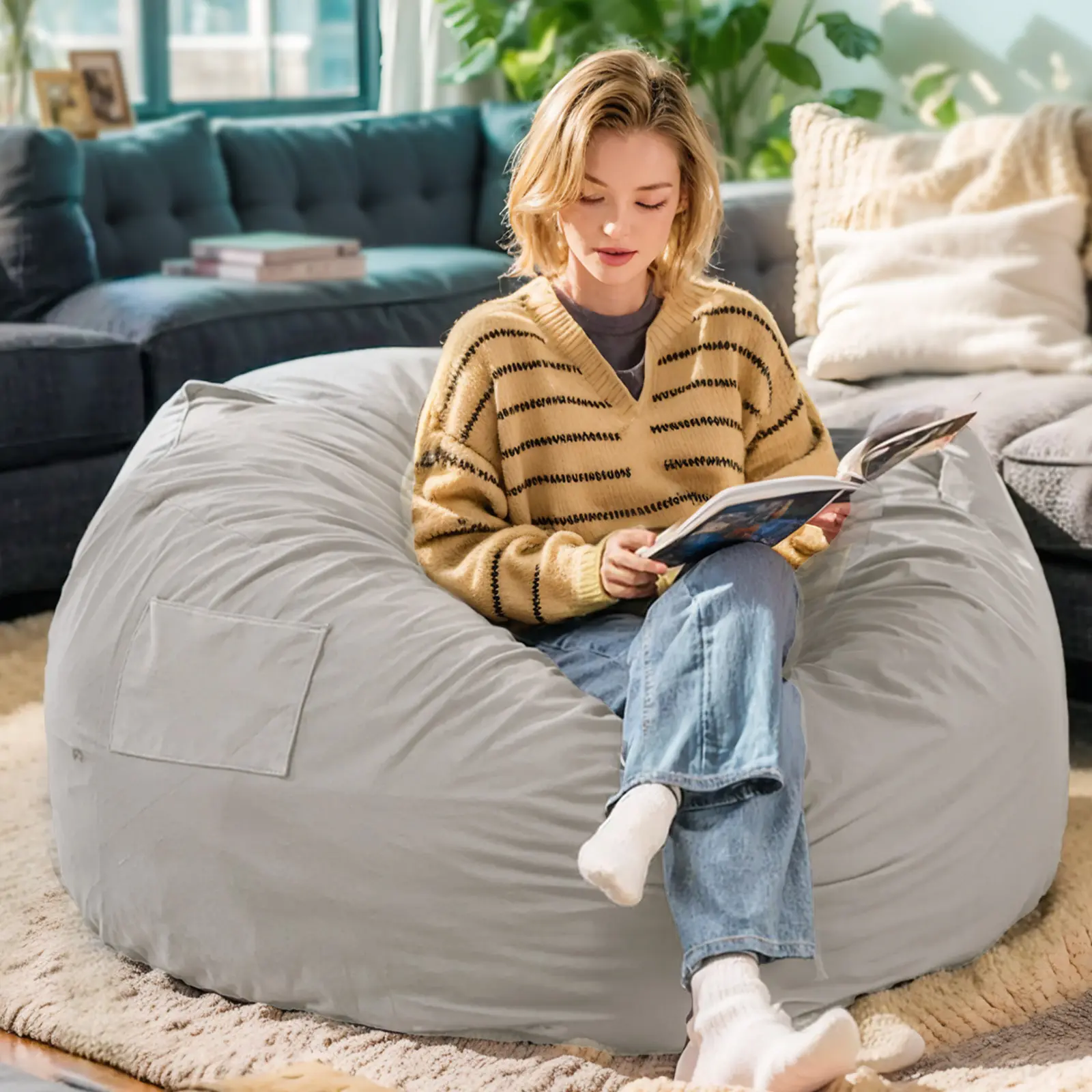 ·【Functional Design】: With a handy carry handle, this giant bean bag is a cinch to move around. Plus, the practical side pocket is perfect for storing small items like remote controls, books, phones, helping you maintain a clutter-free space.