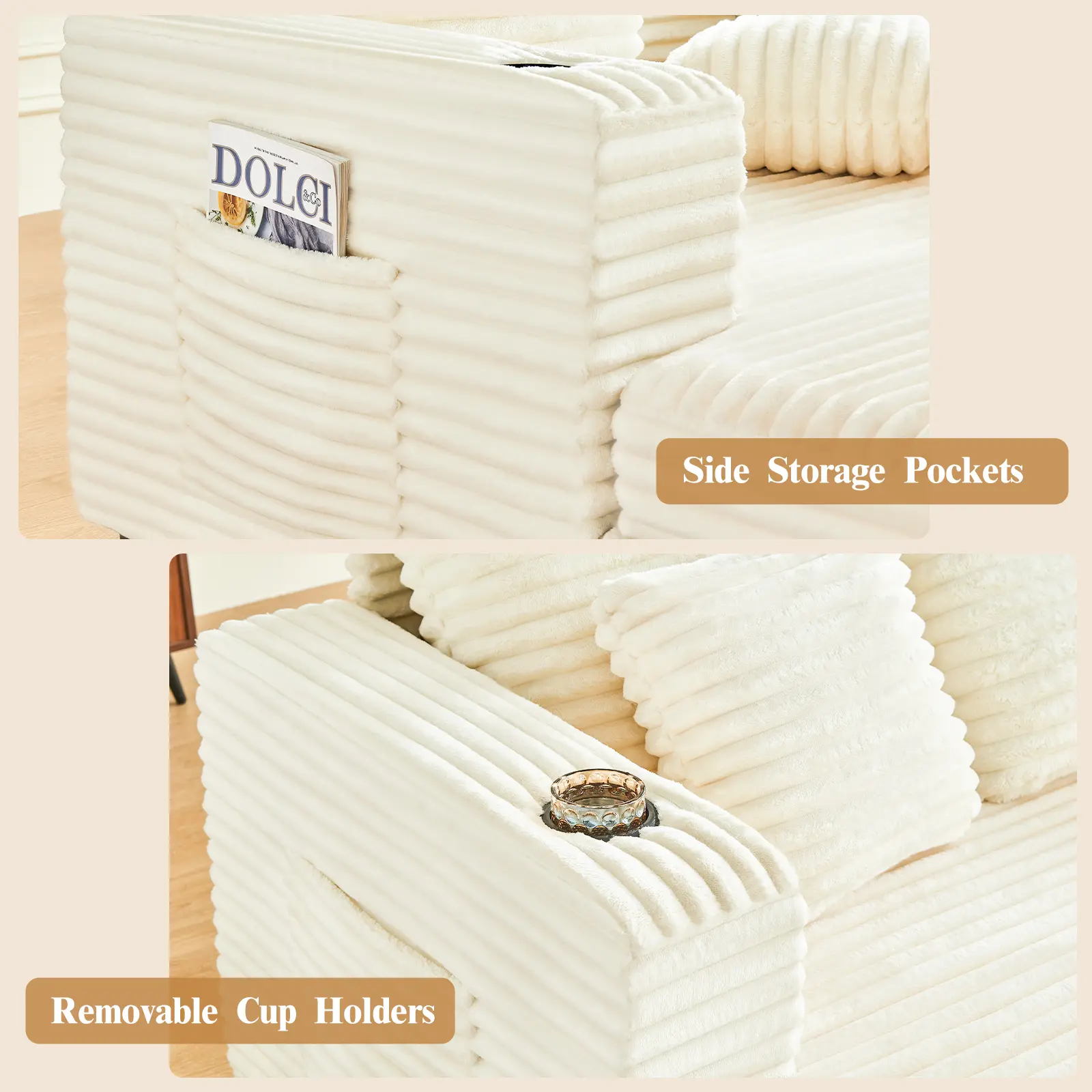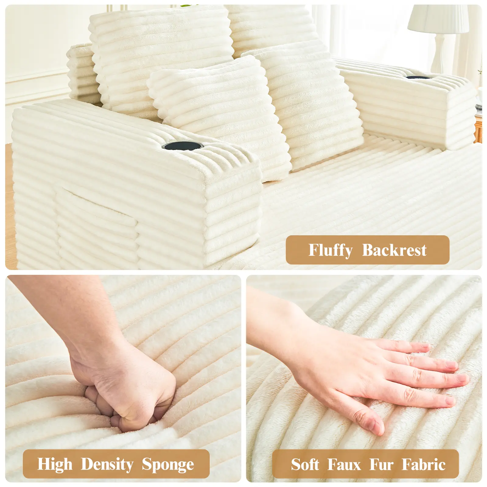 Oversized Chaise Lounge Chair Indoor, 49" Upholstered Sofa Bed with Frame, Plush Faux Fur Sleeper Couch with Throw Pillows, Armrests&Cup Holders, Deep Seat Reading Chair for Living Room, Bedroom,Beige