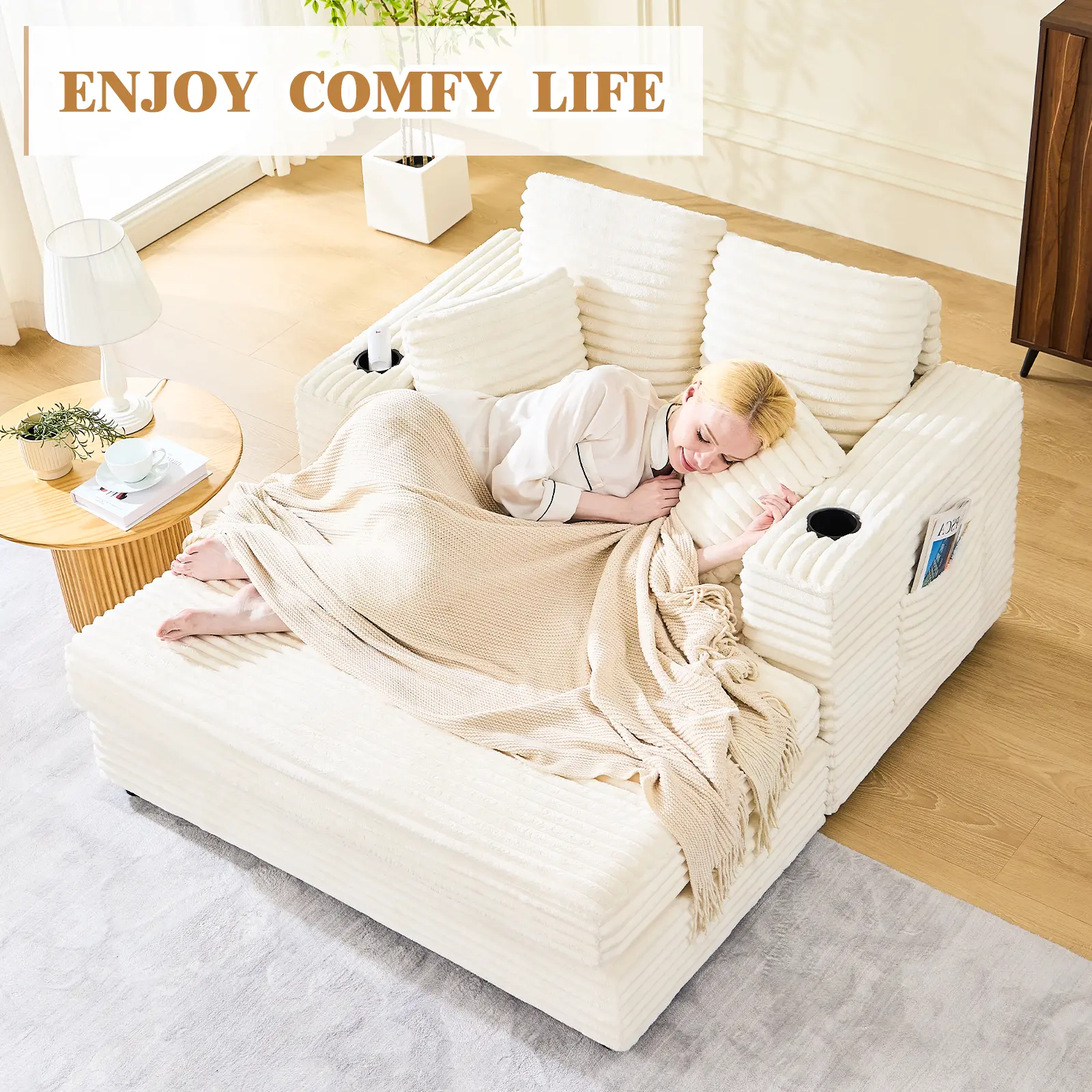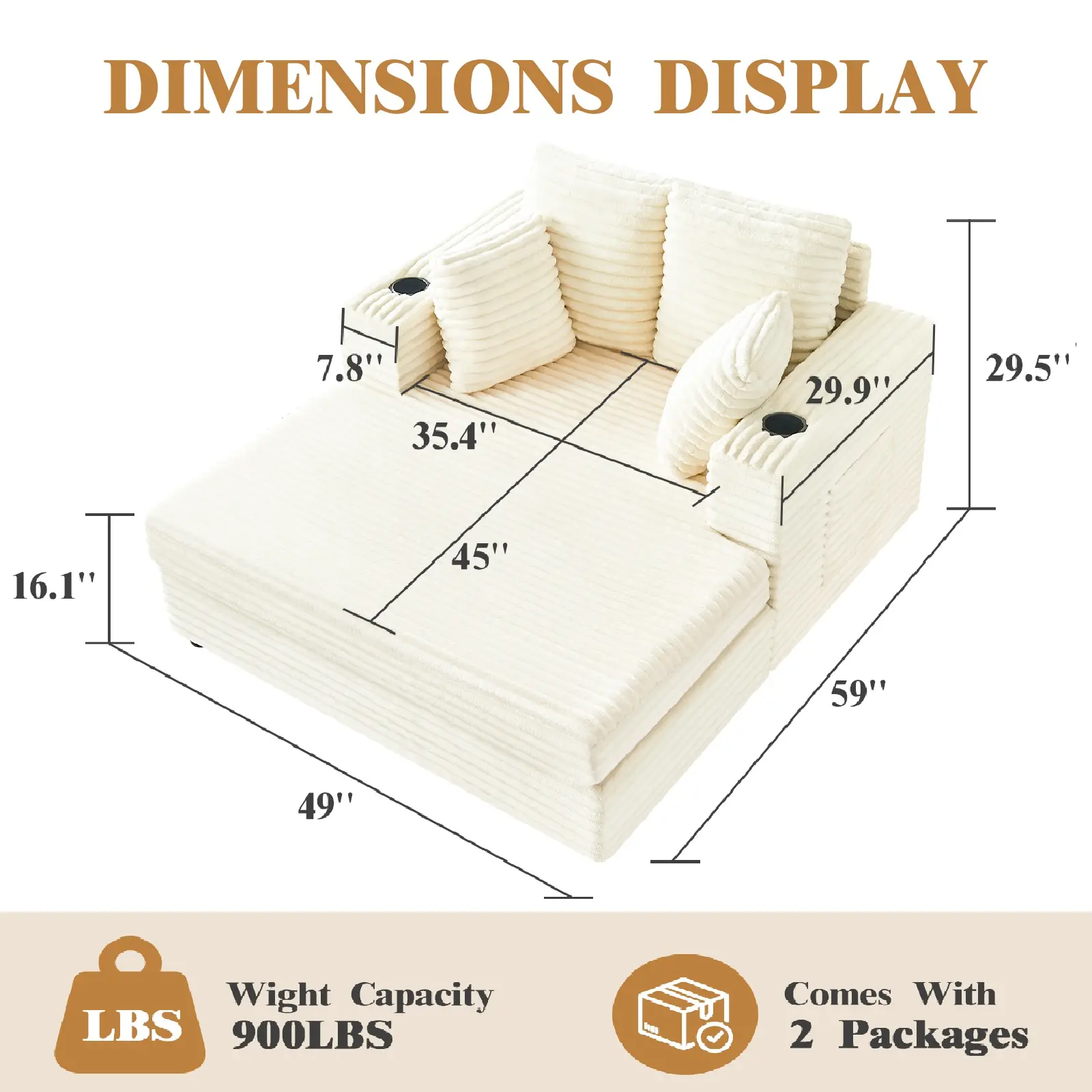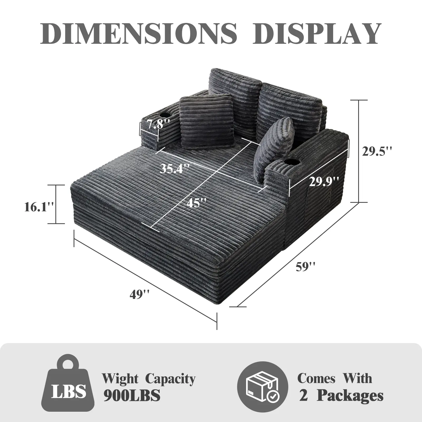 This chaise lounge includes armrests and cup holders for added convenience. The frame supports the weighty design, ensuring stability. It's not just a couch; it's a multifunctional piece for your home. The included throw pillows enhance its appeal, making it a cozy retreat for any room.