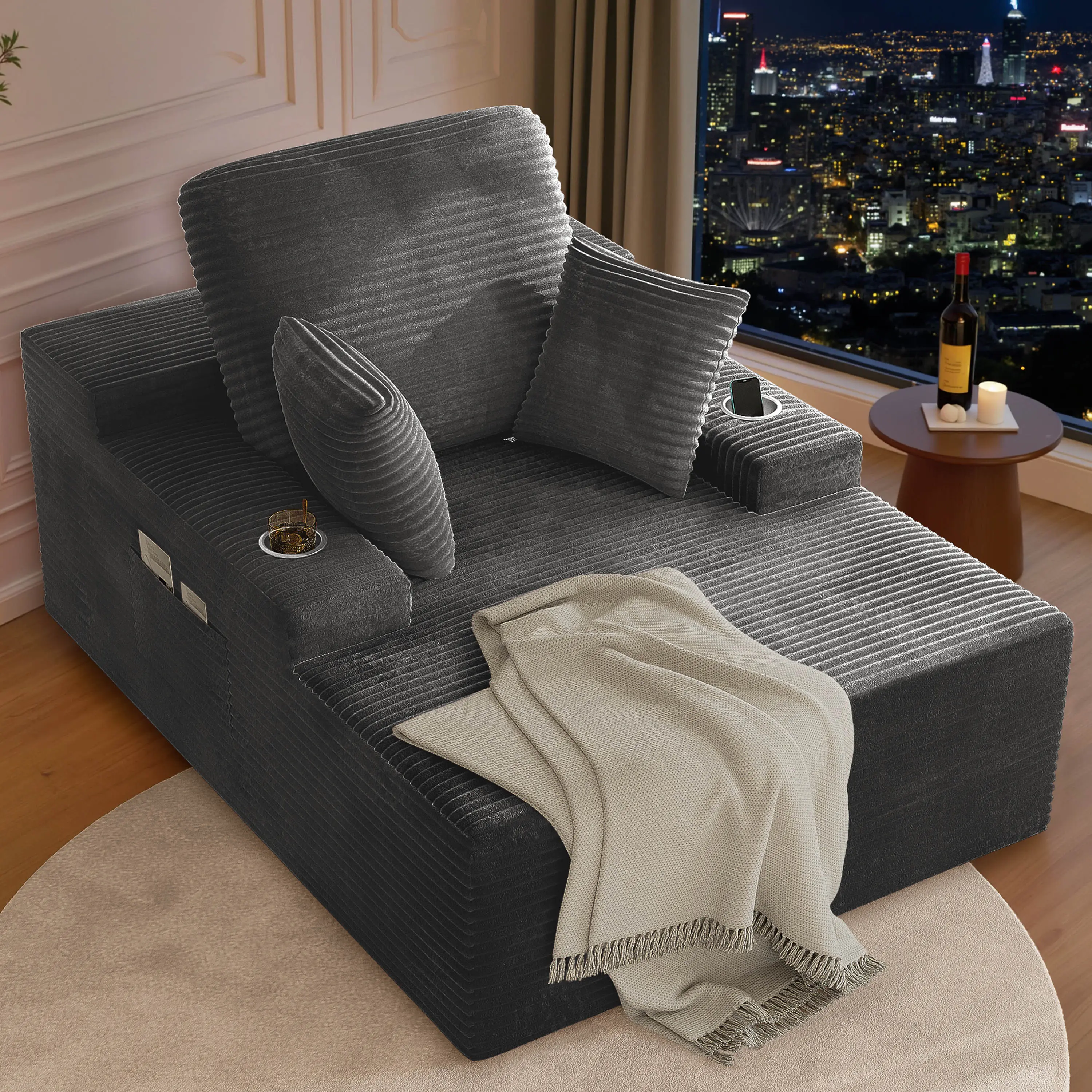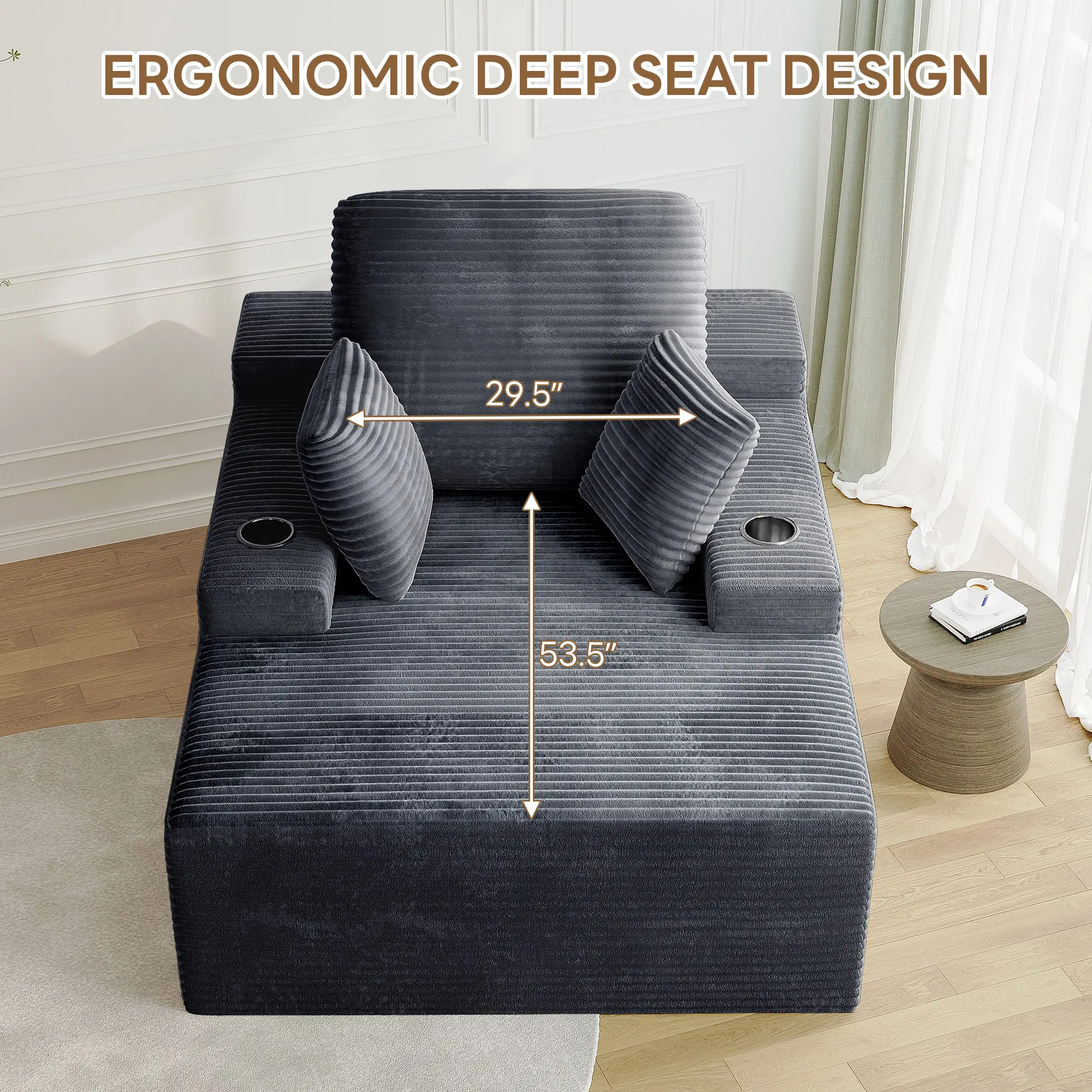 ·DEEP SEAT CHAISE LOUNGE: Sink into expansive relaxation! This oversized chaise lounge boasts a generously deep seat design, offering a spacious sanctuary for curling up, movie nights, reading, or napping. Whether you're tall or love to stretch freely, find your perfect position on this versatile couch that doubles as a comfortable sofa bed – perfect for living rooms, bedrooms, or home theaters.