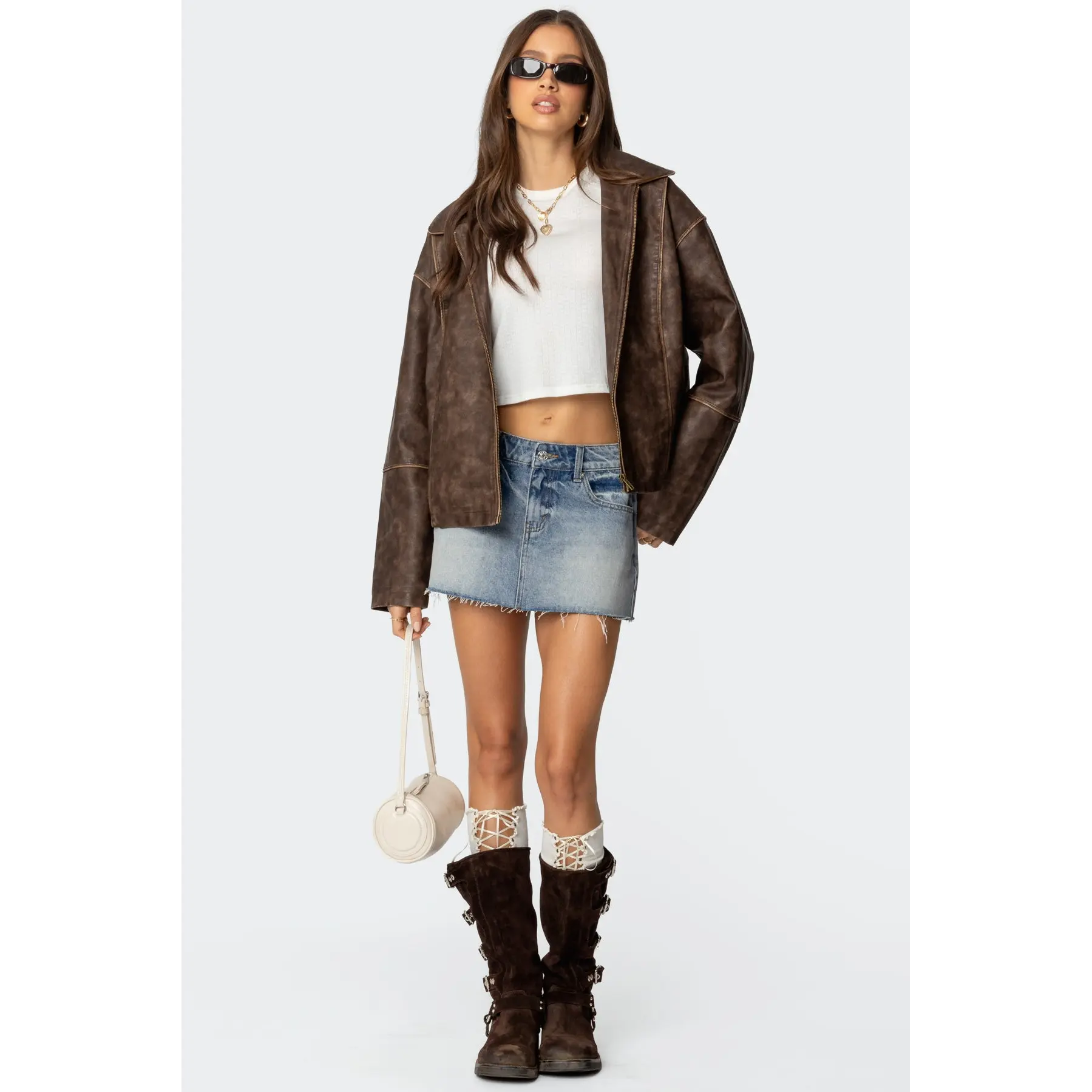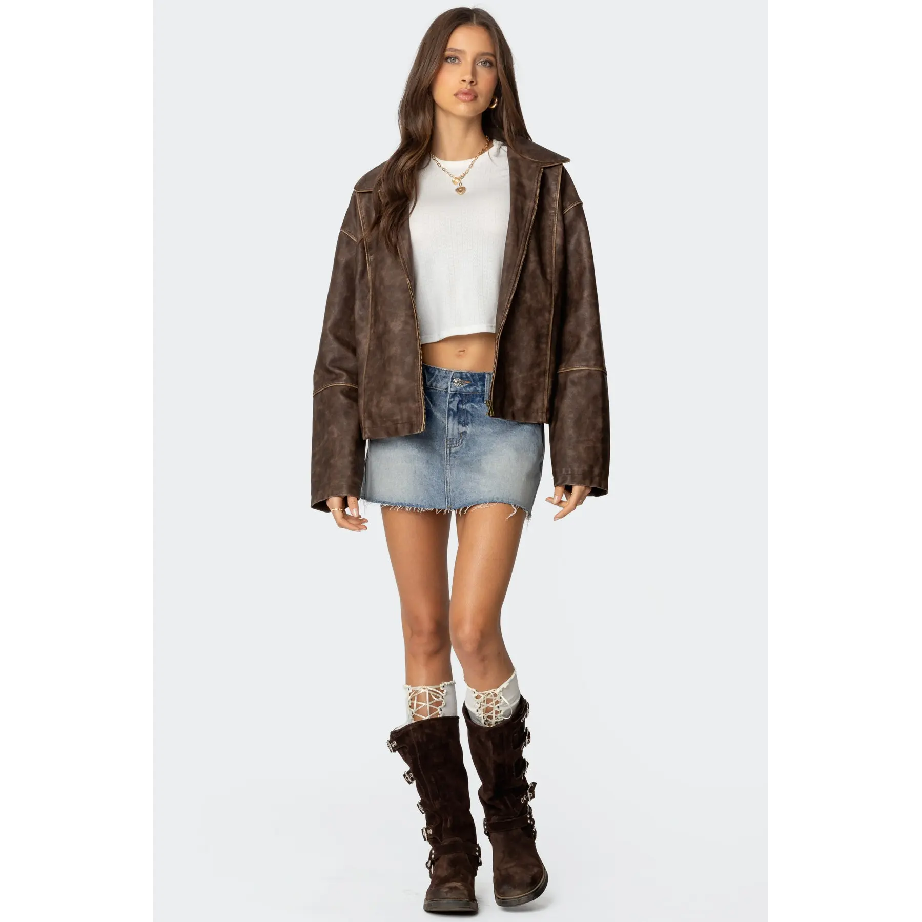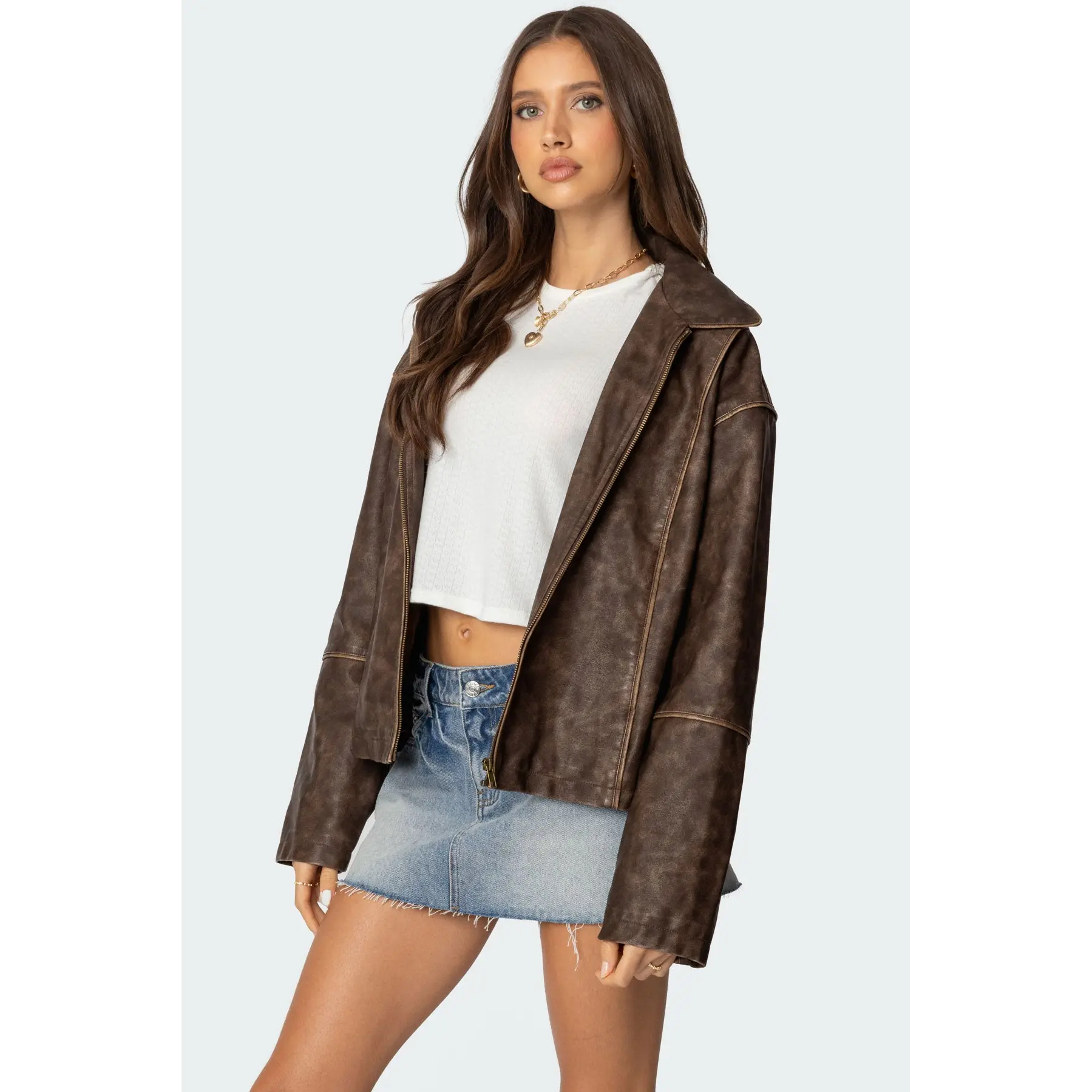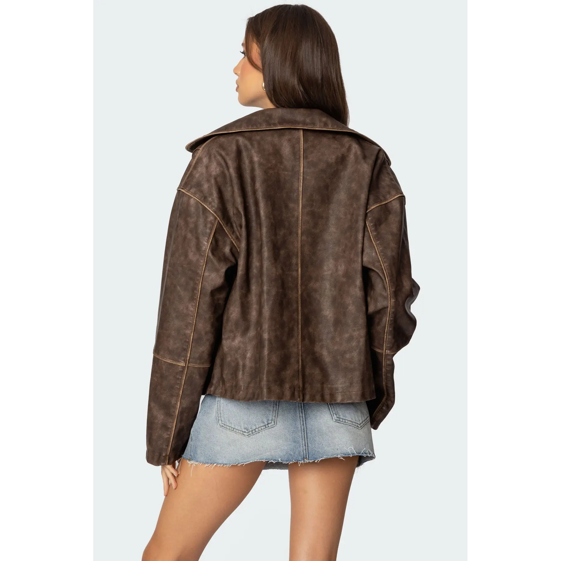 Very soft pleather, size up if you want the āoversizedā fit/look