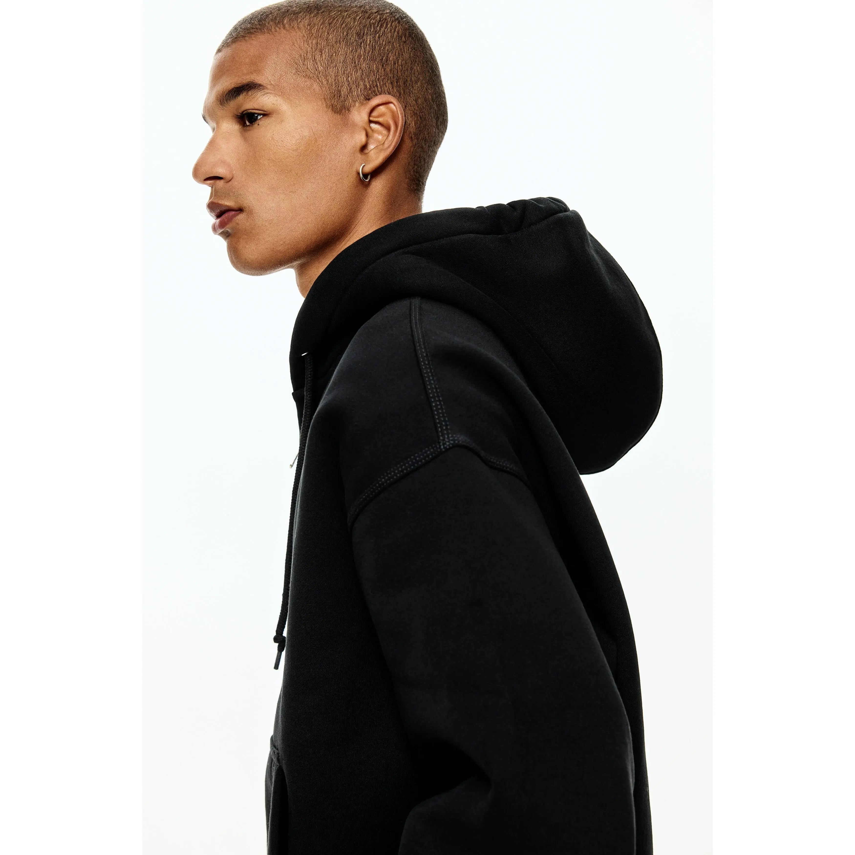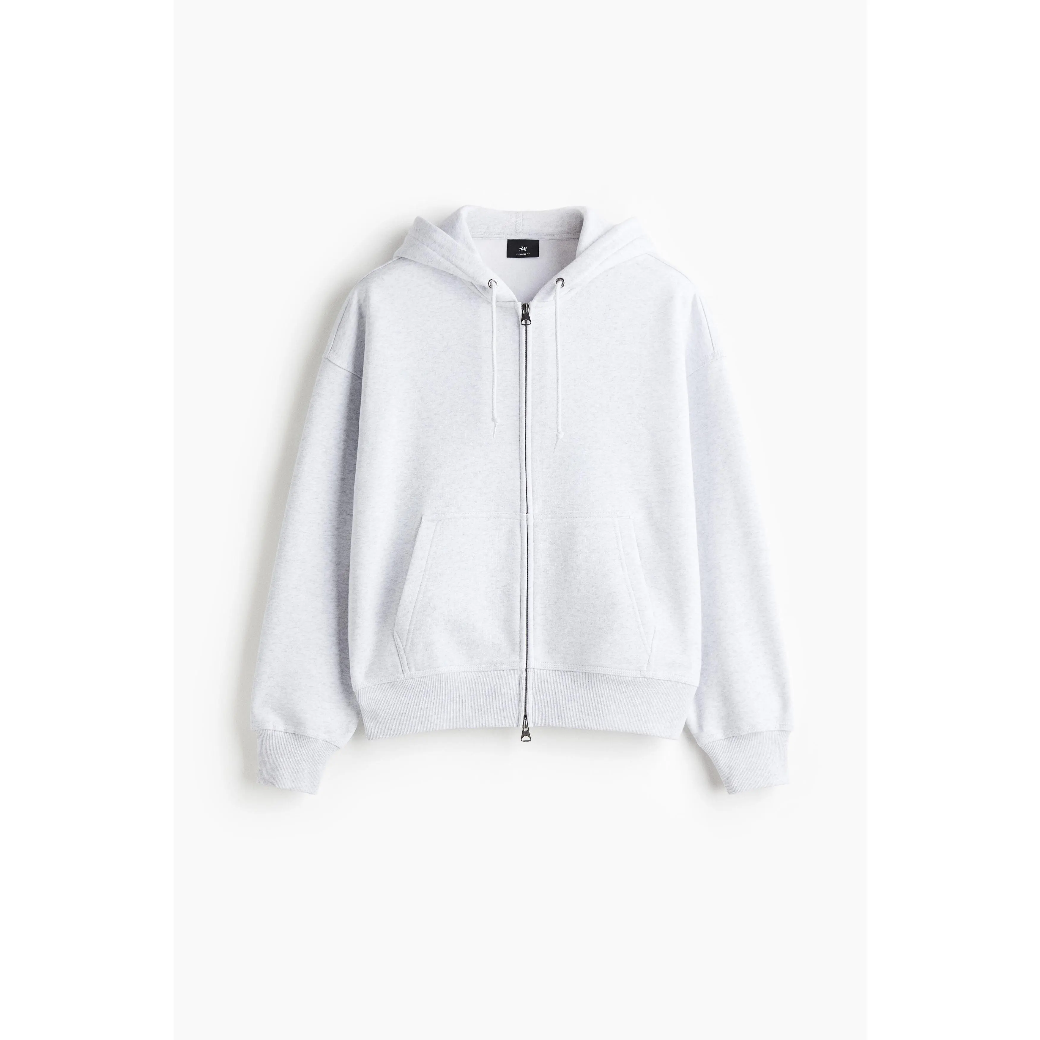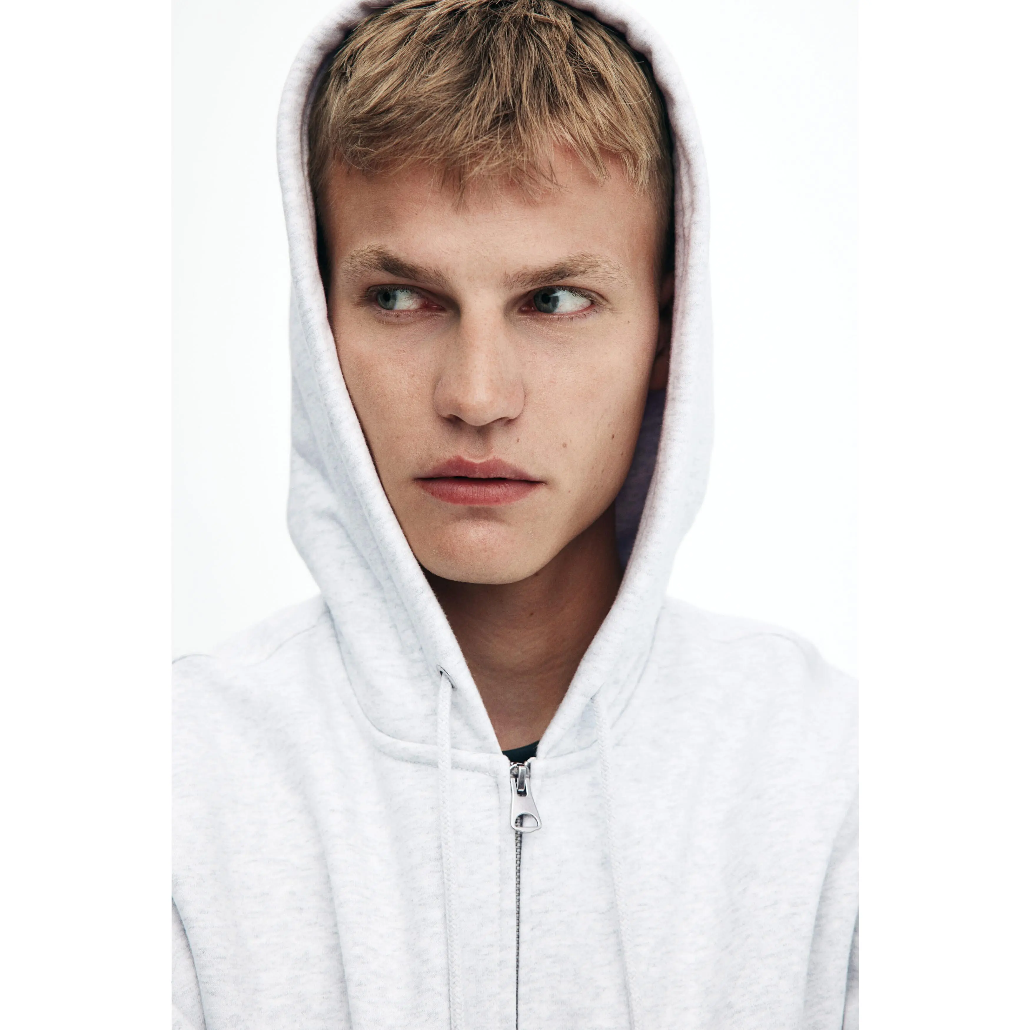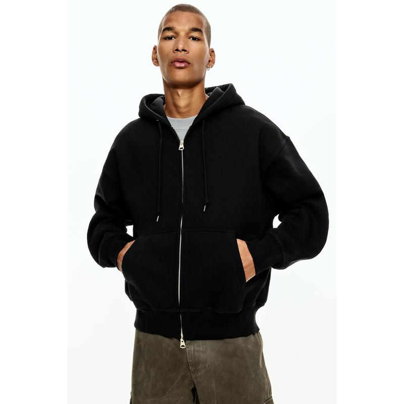 Zip-through hoodie in heavyweight sweatshirt fabric made from a cotton blend with a soft brushed inside. Jersey-lined, drawstring hood, a zip down the front, dropped shoulders and long sleeves. Front pockets and ribbing at the cuffs and hem. Oversized fit for a baggy, extra-loose silhouette.