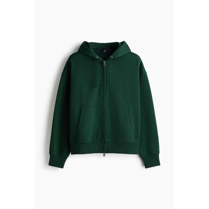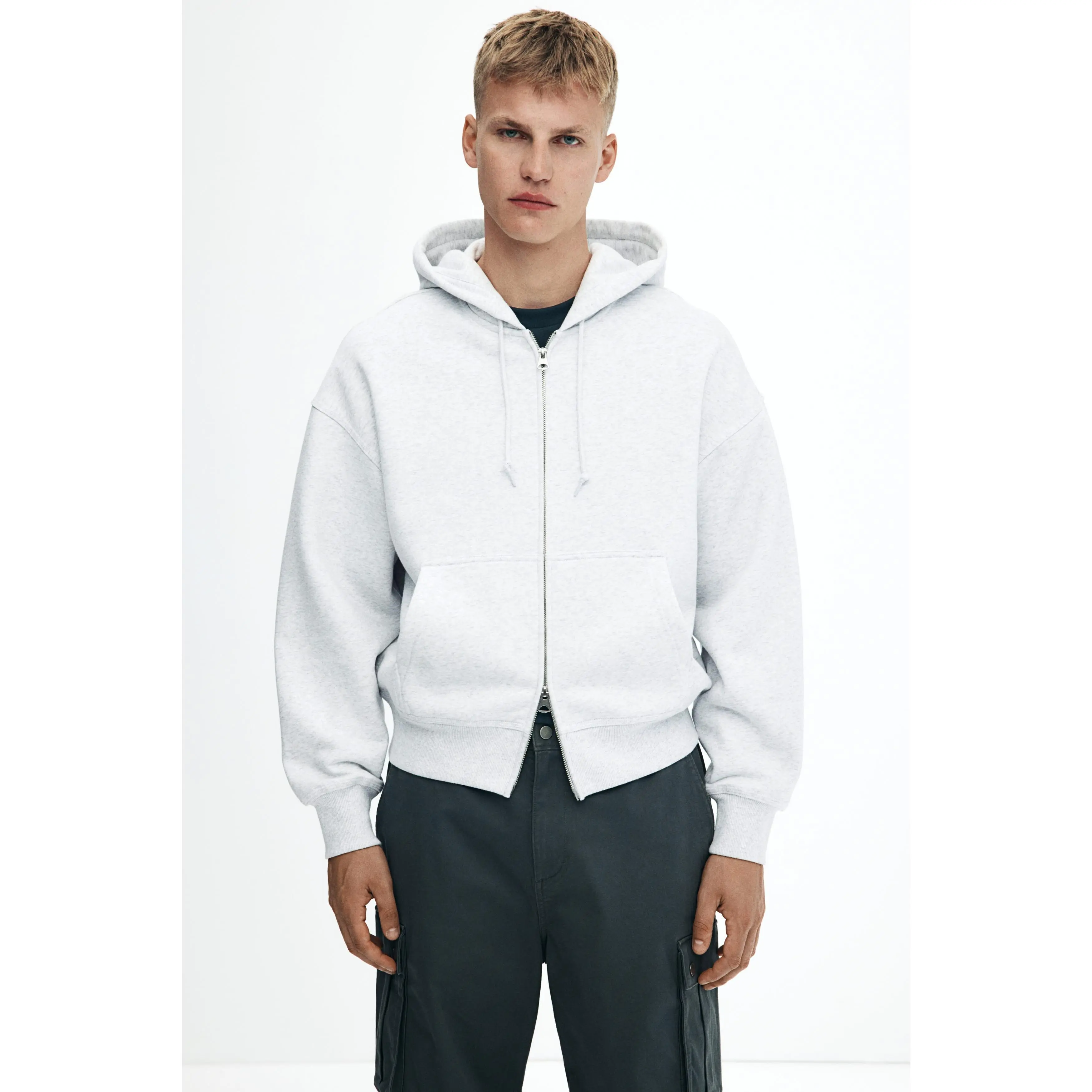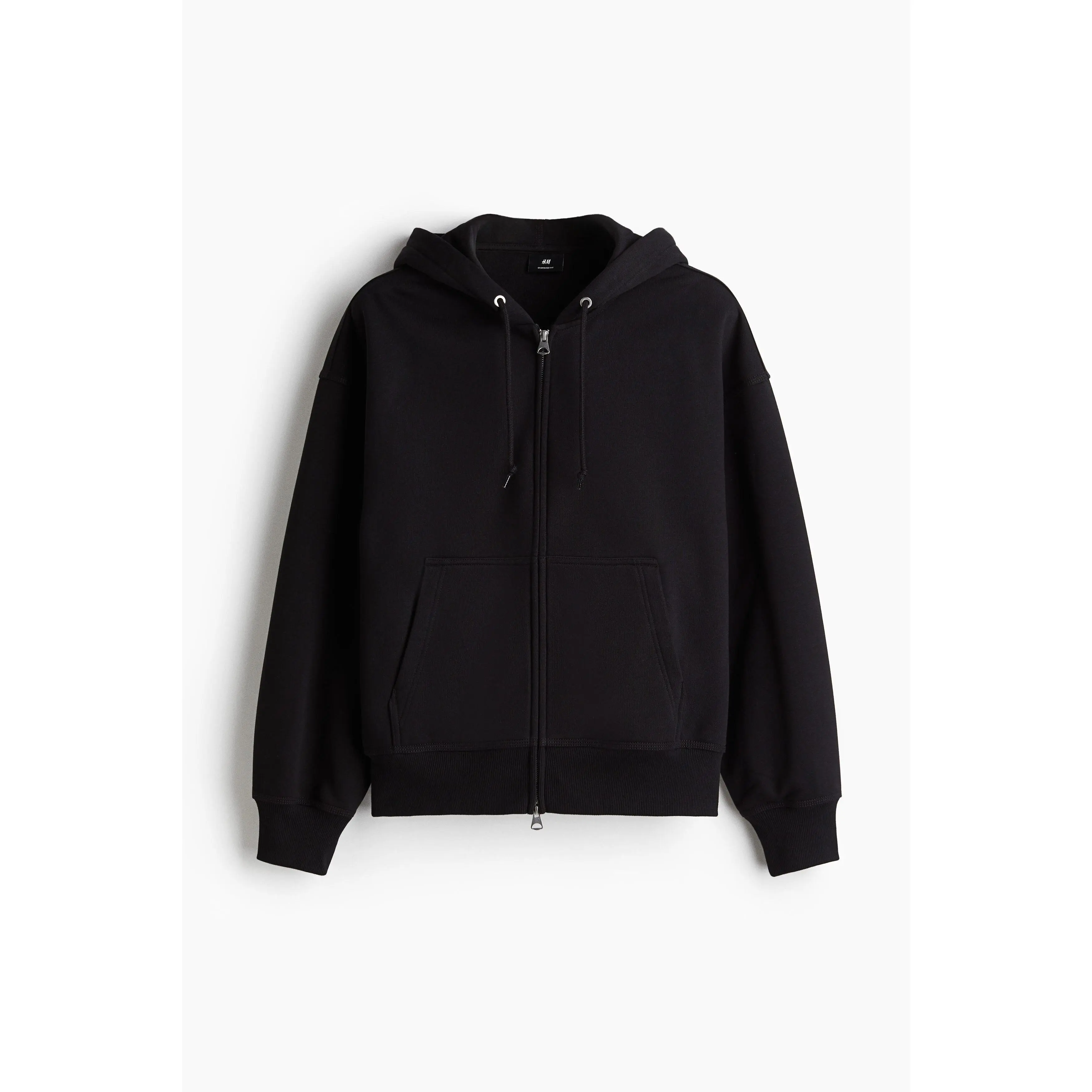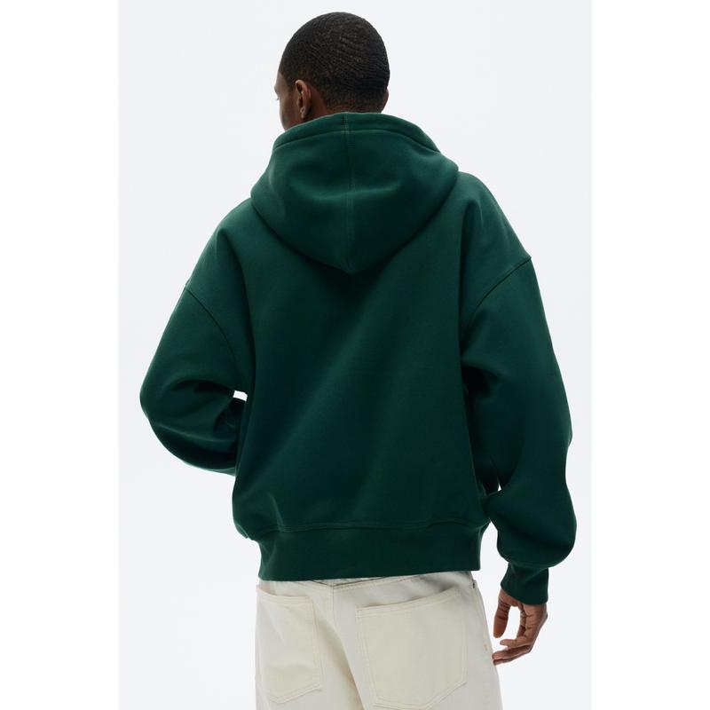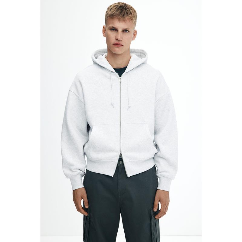 Zip-through hoodie in heavyweight sweatshirt fabric made from a cotton blend with a soft brushed inside. Jersey-lined, drawstring hood, a zip down the front, dropped shoulders and long sleeves. Front pockets and ribbing at the cuffs and hem. Oversized fit for a baggy, extra-loose silhouette.