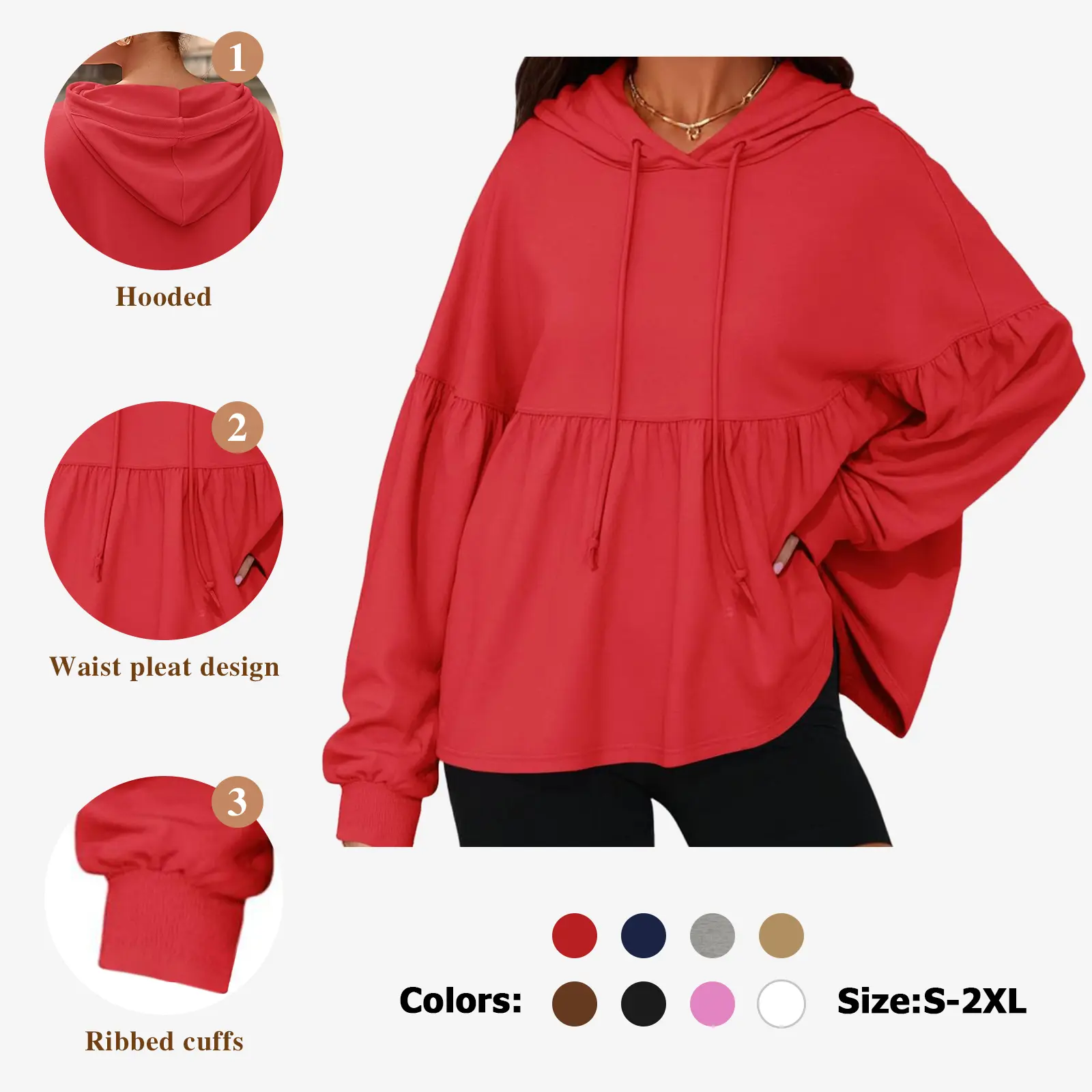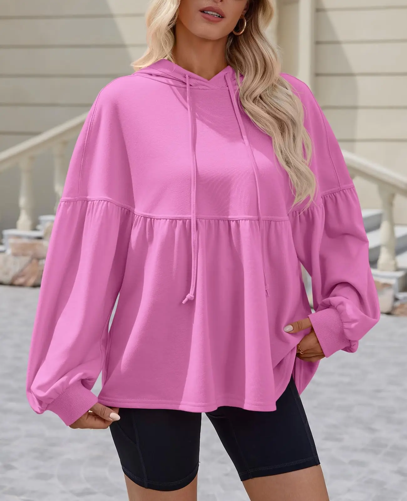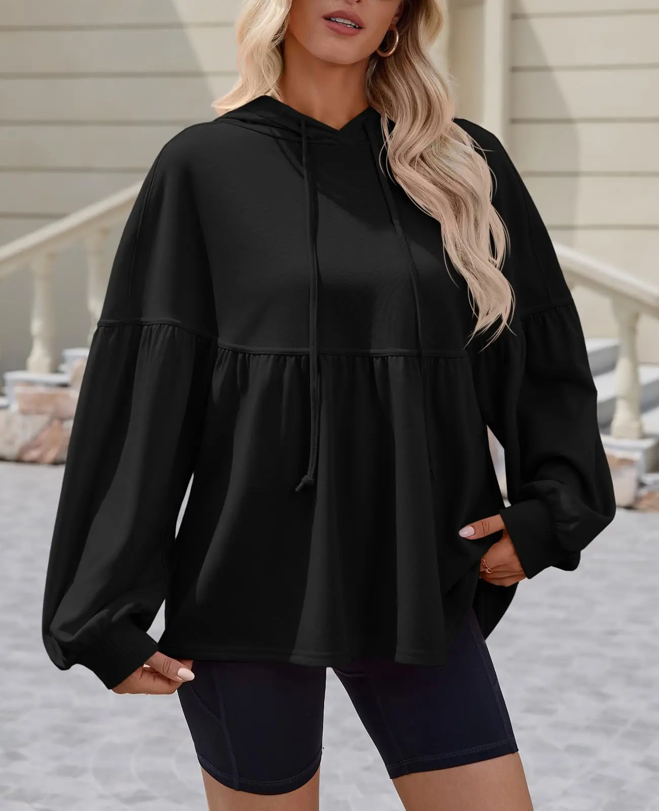 This pullover top features a spacious hood, drop shoulder lantern sleeves, and a chic raw rolled hem. These unique details provide a distinctive look that stands out. The design is both functional and fashionable, making it a standout choice.