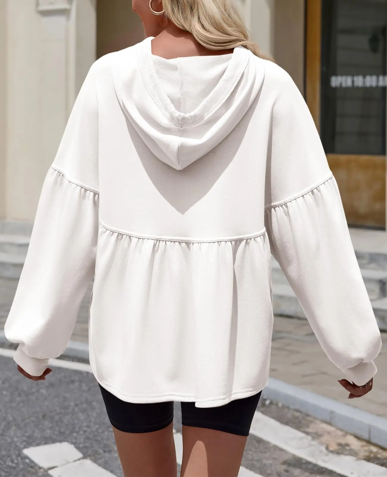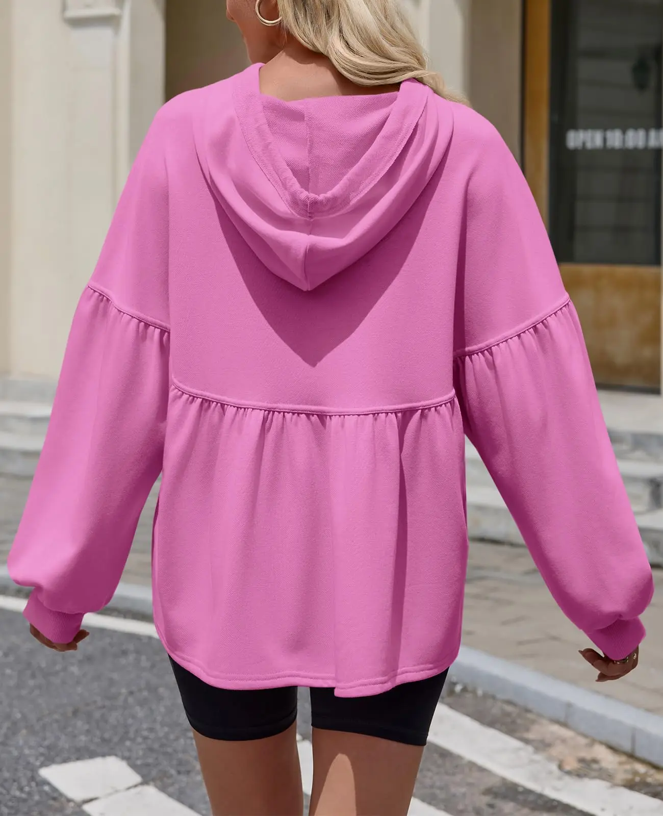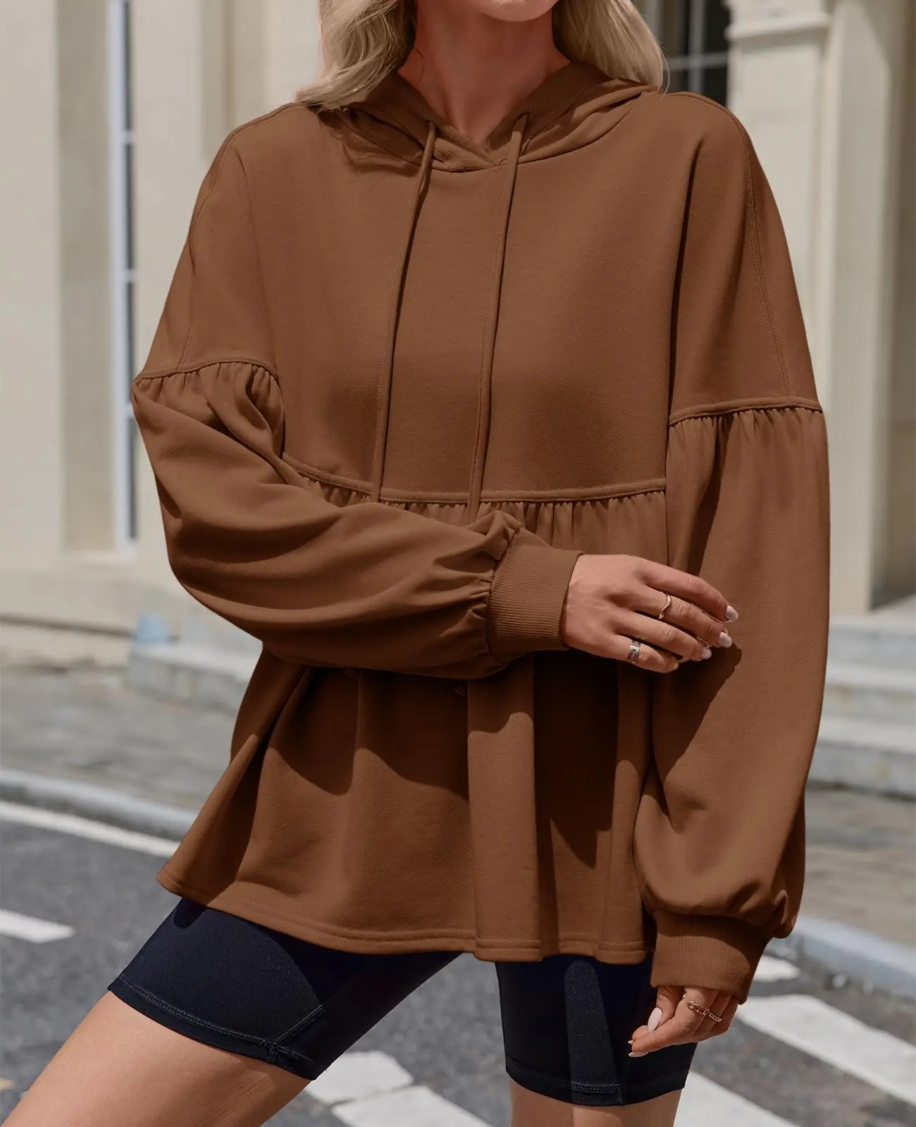 This pullover top features a spacious hood, drop shoulder lantern sleeves, and a chic raw rolled hem. These unique details provide a distinctive look that stands out. The design is both functional and fashionable, making it a standout choice.