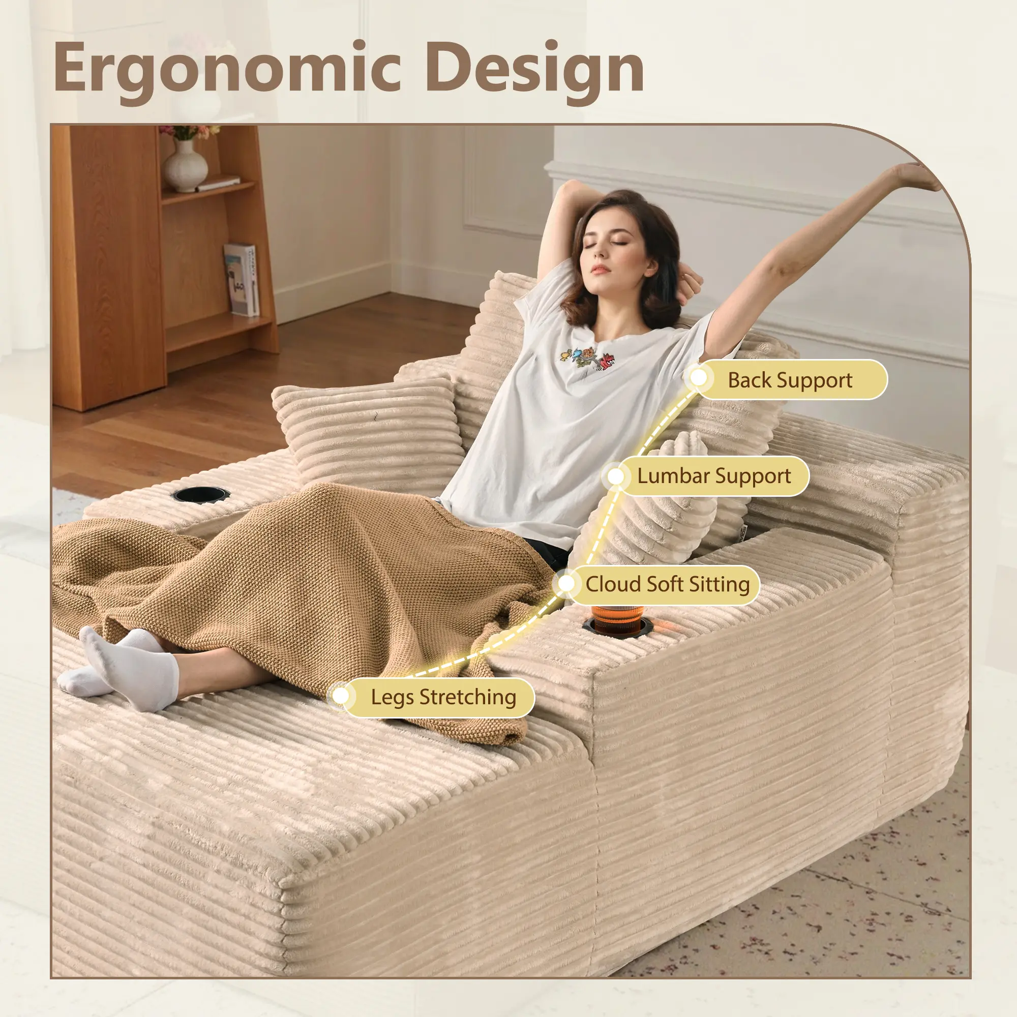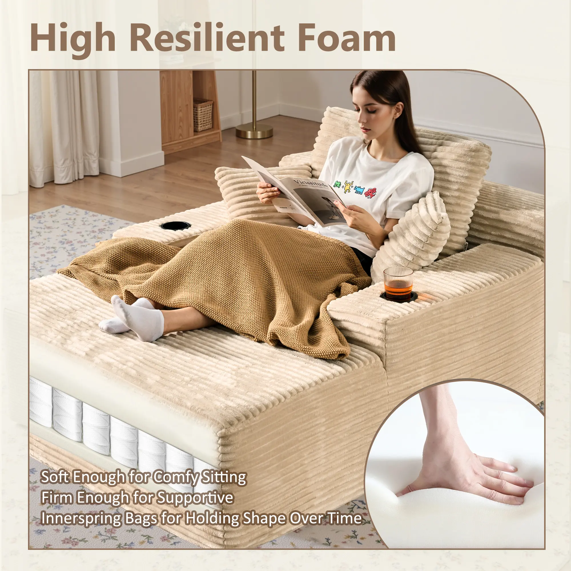 The sofa bed includes practical cup holders and a reading chair, enhancing its functionality. Its corduroy texture adds a touch of elegance to your decor. Ideal for lounging or sleeping, this couch adapts seamlessly to your needs. The design ensures both comfort and style, making it a standout piece in your living room.