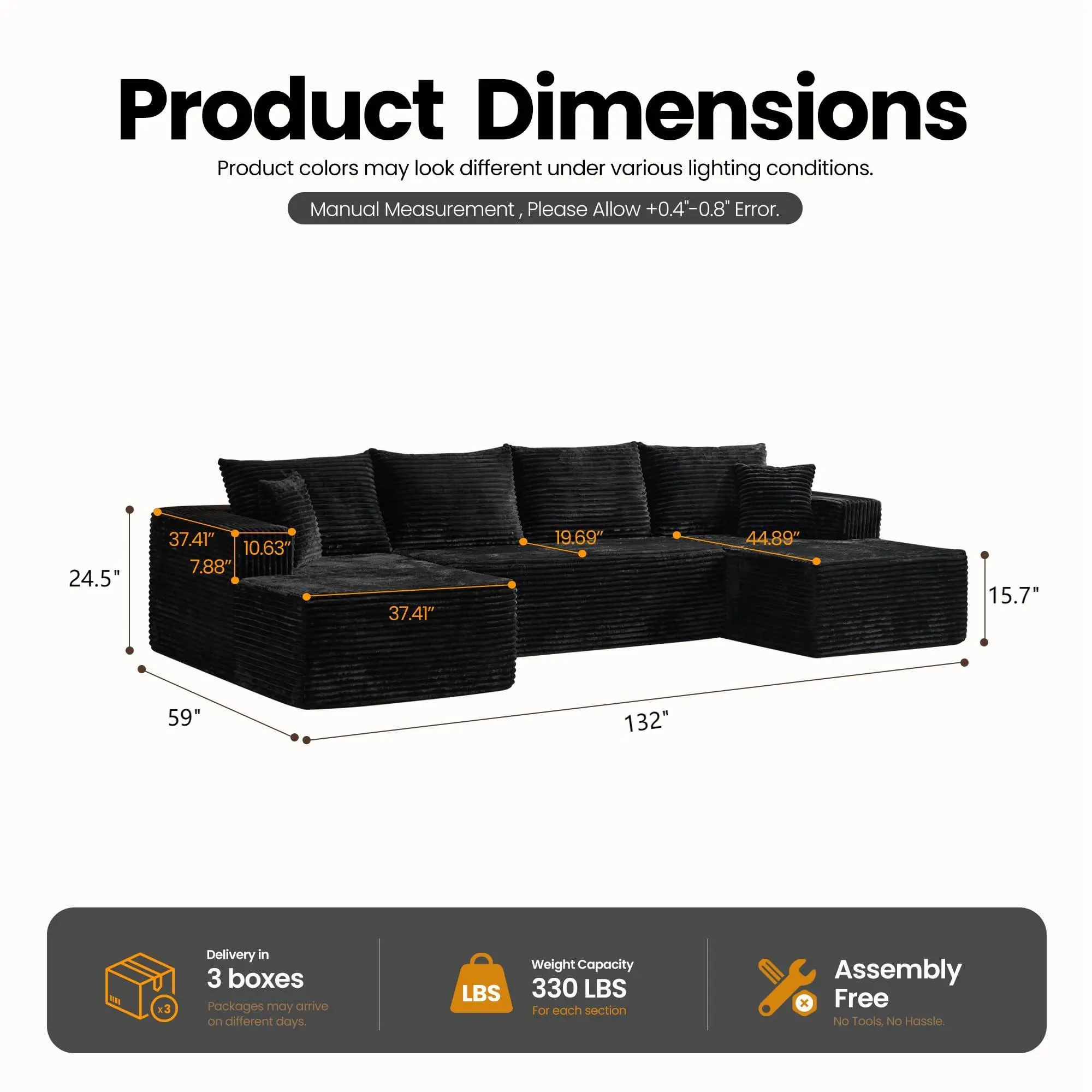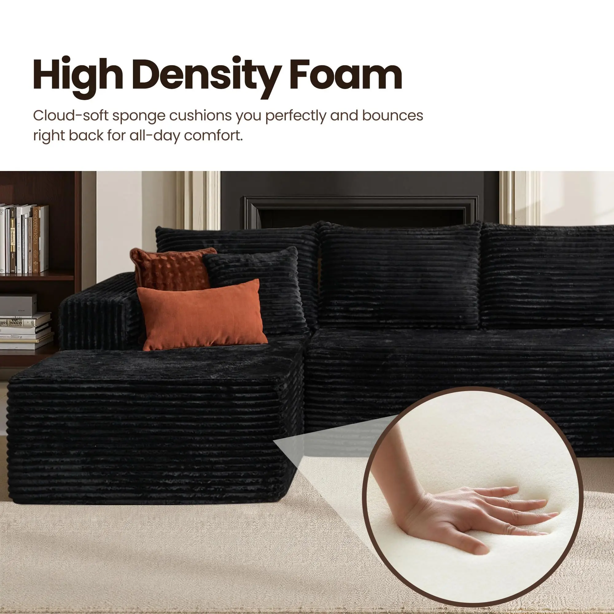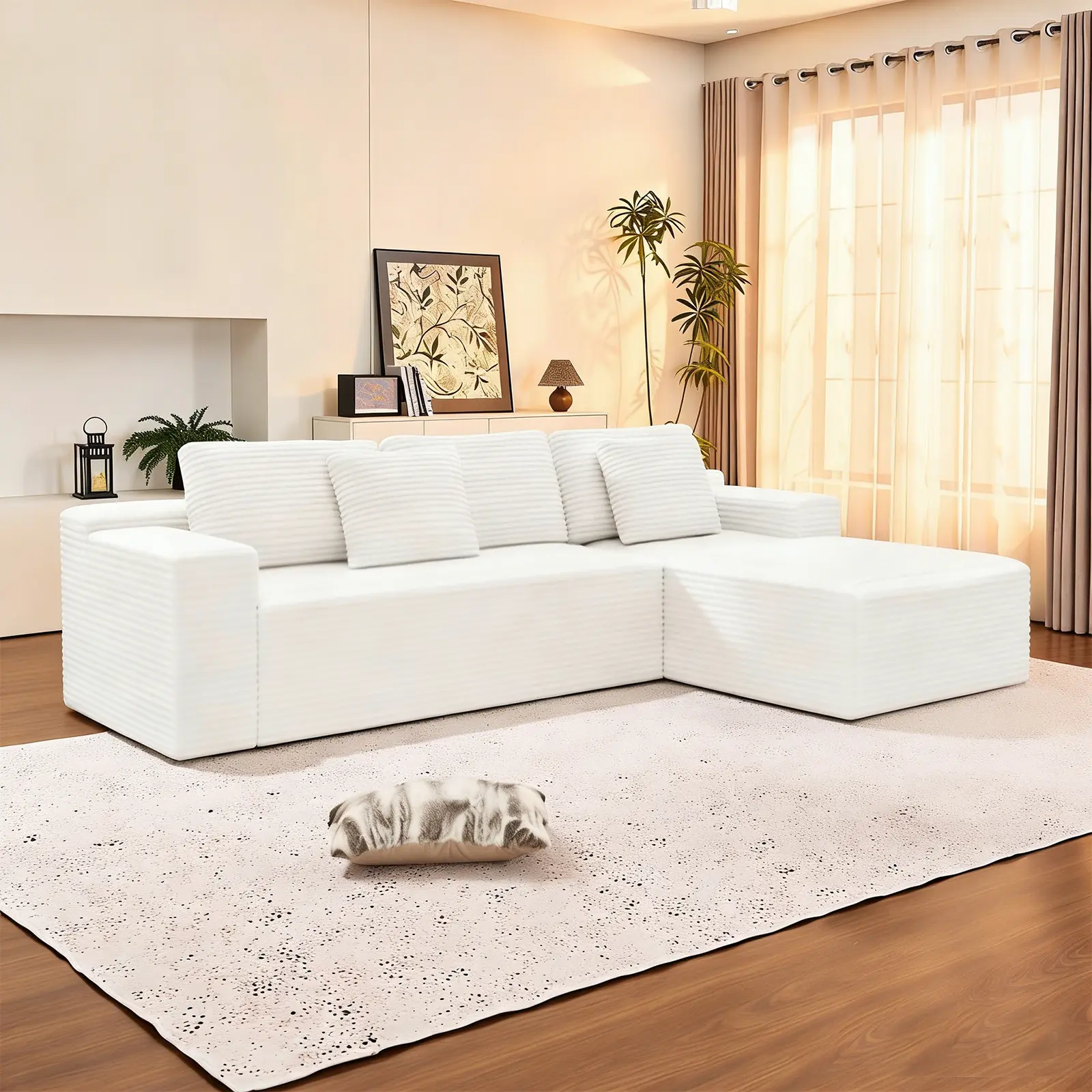 ✨ Upgrade your living room, bedroom, or office with our 133-inch U-shaped corduroy modular sofa. This cloud-style sofa is an oversized option, ideal for any space. It includes pillows and a chaise, making it a 5-seater. No assembly is required, ensuring a quick setup. Perfect for those seeking versatility.