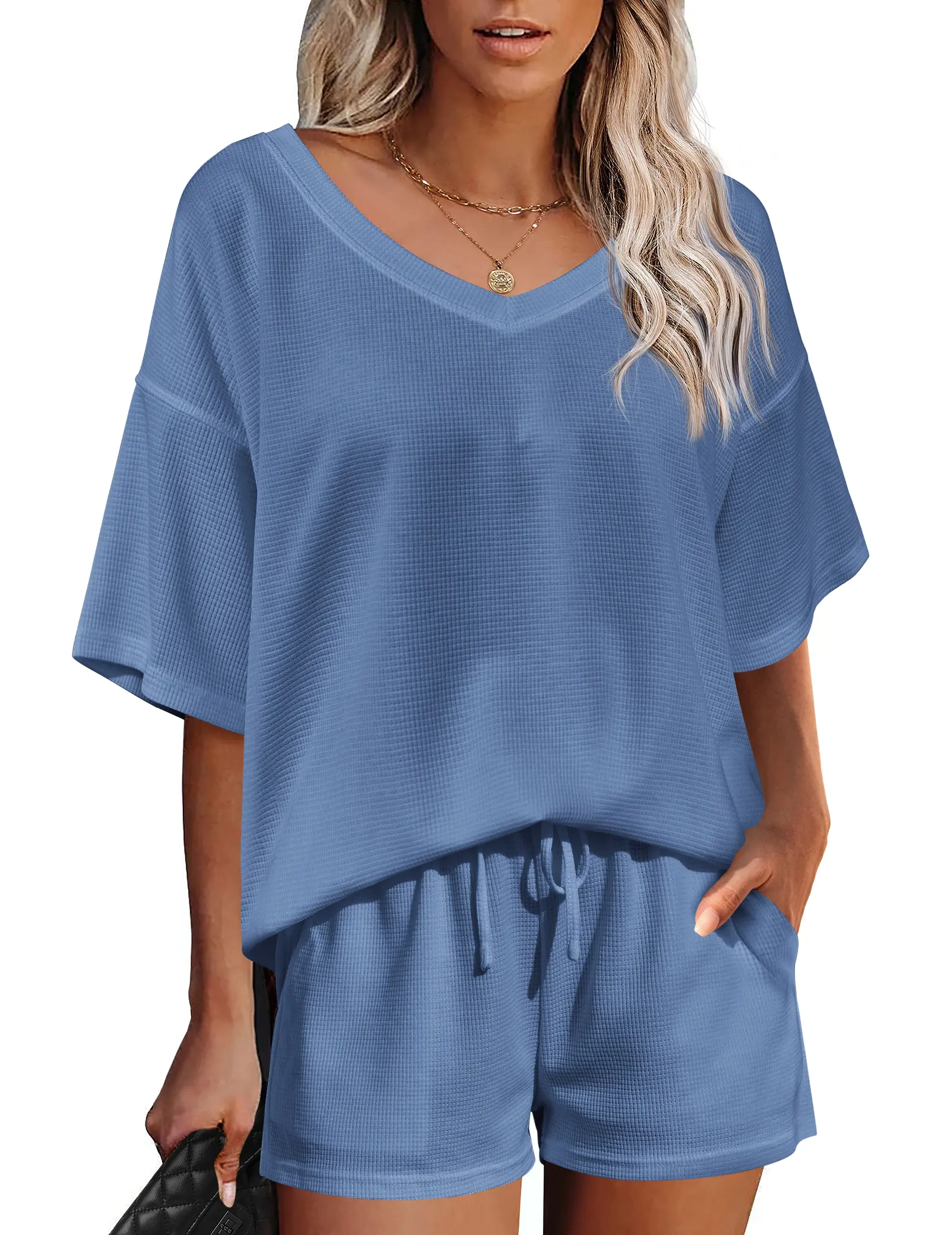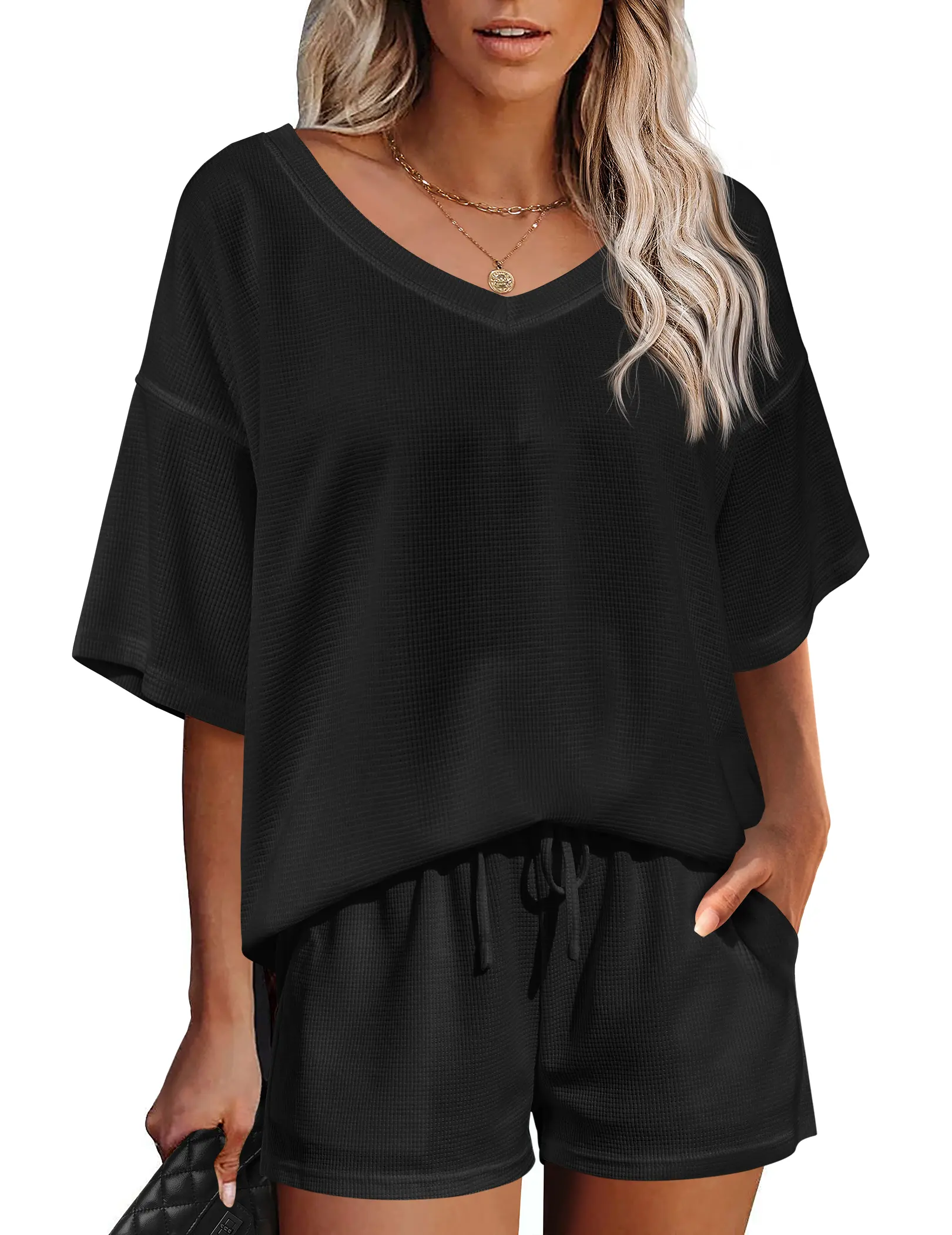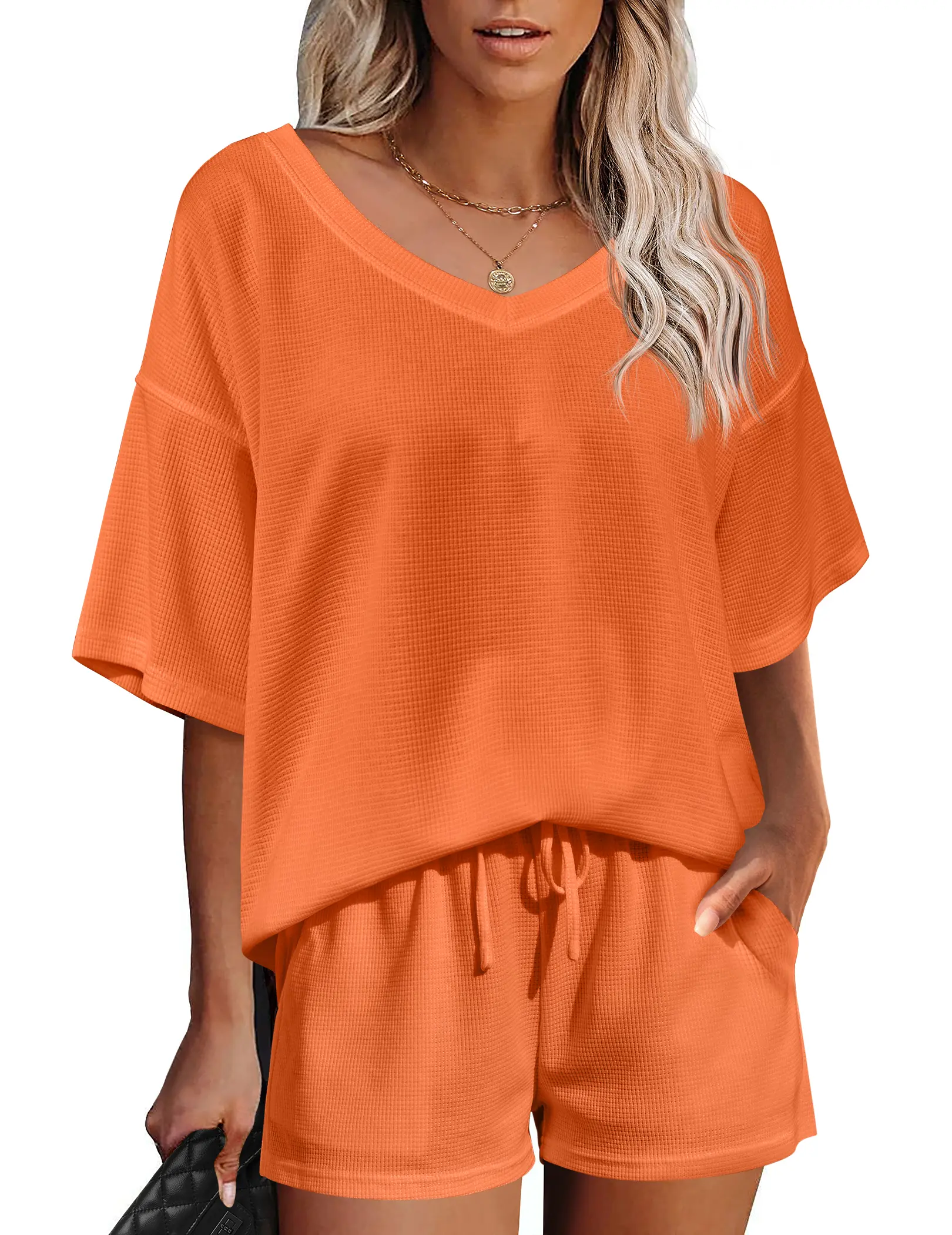 ·【Unique Design】Cute and loose lounge sets features stylish v-neck, drop the shoulder, oversized loose fit, waffle pattern and short sleeve design. Casual and sexy in daily life. Simple solid colors never out of stylish, relaxed fit, elastic waistband and drawstring are designed to offer your comfort.