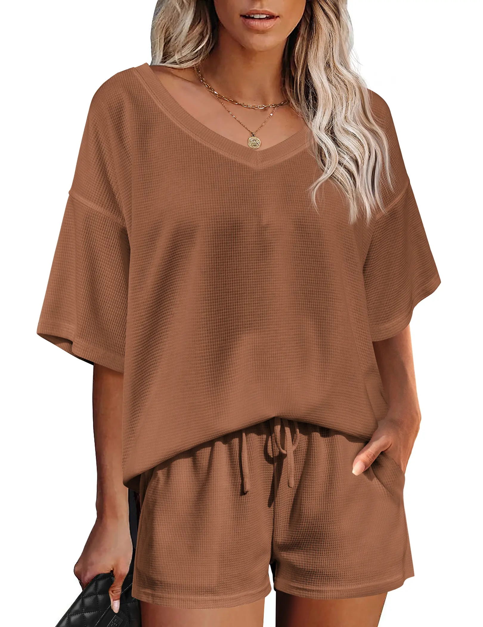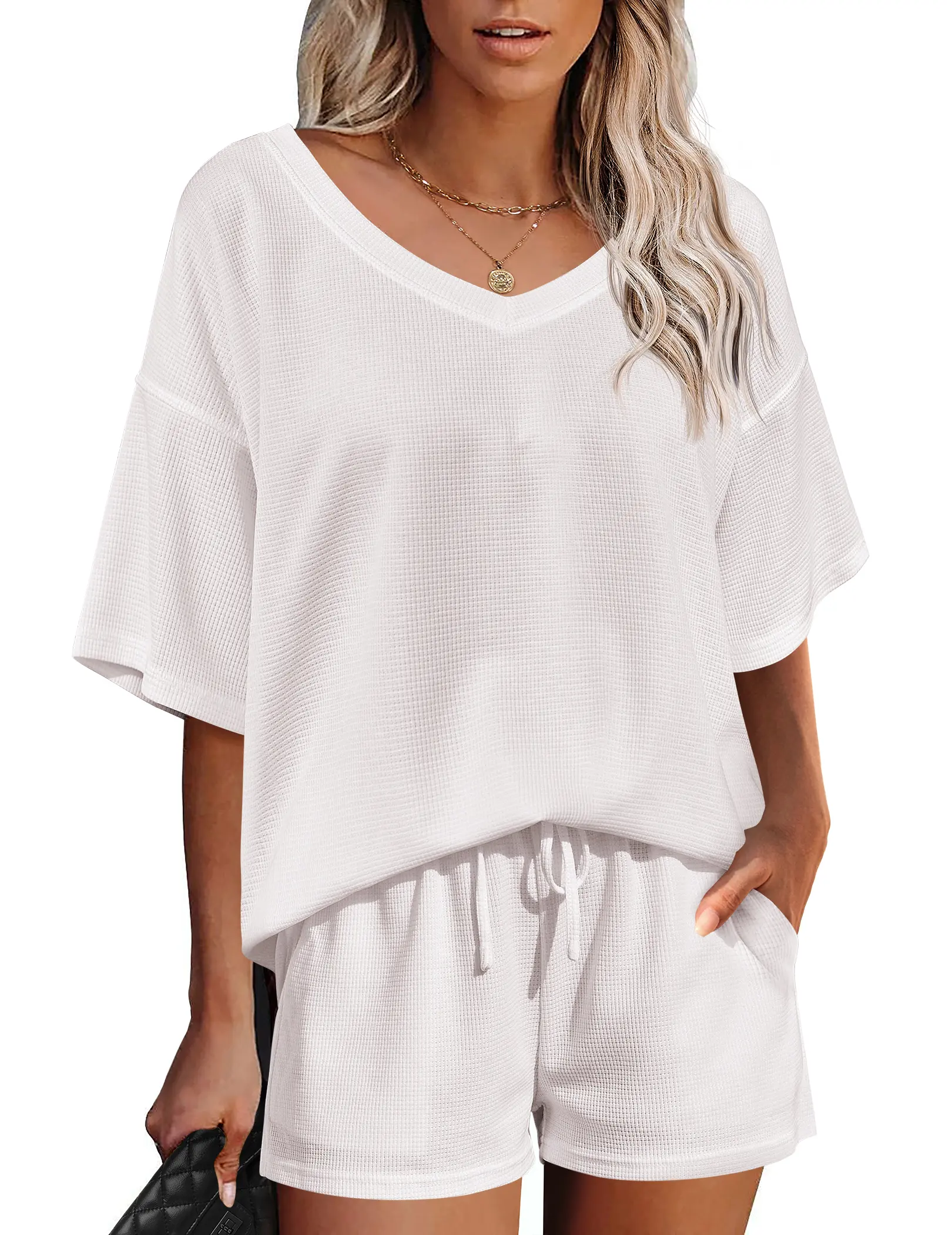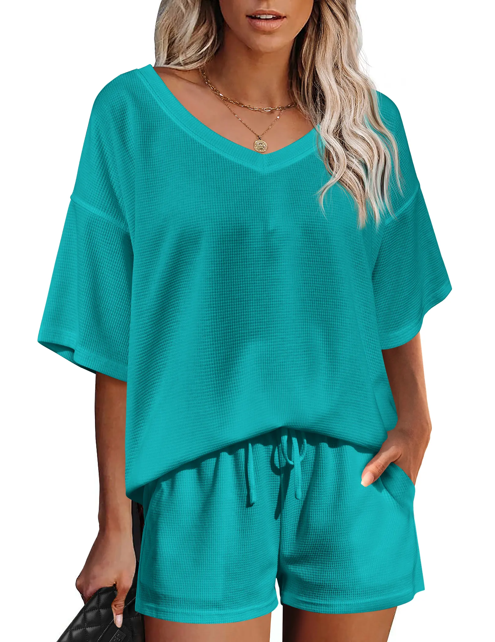 ·【Unique Design】Cute and loose lounge sets features stylish v-neck, drop the shoulder, oversized loose fit, waffle pattern and short sleeve design. Casual and sexy in daily life. Simple solid colors never out of stylish, relaxed fit, elastic waistband and drawstring are designed to offer your comfort.