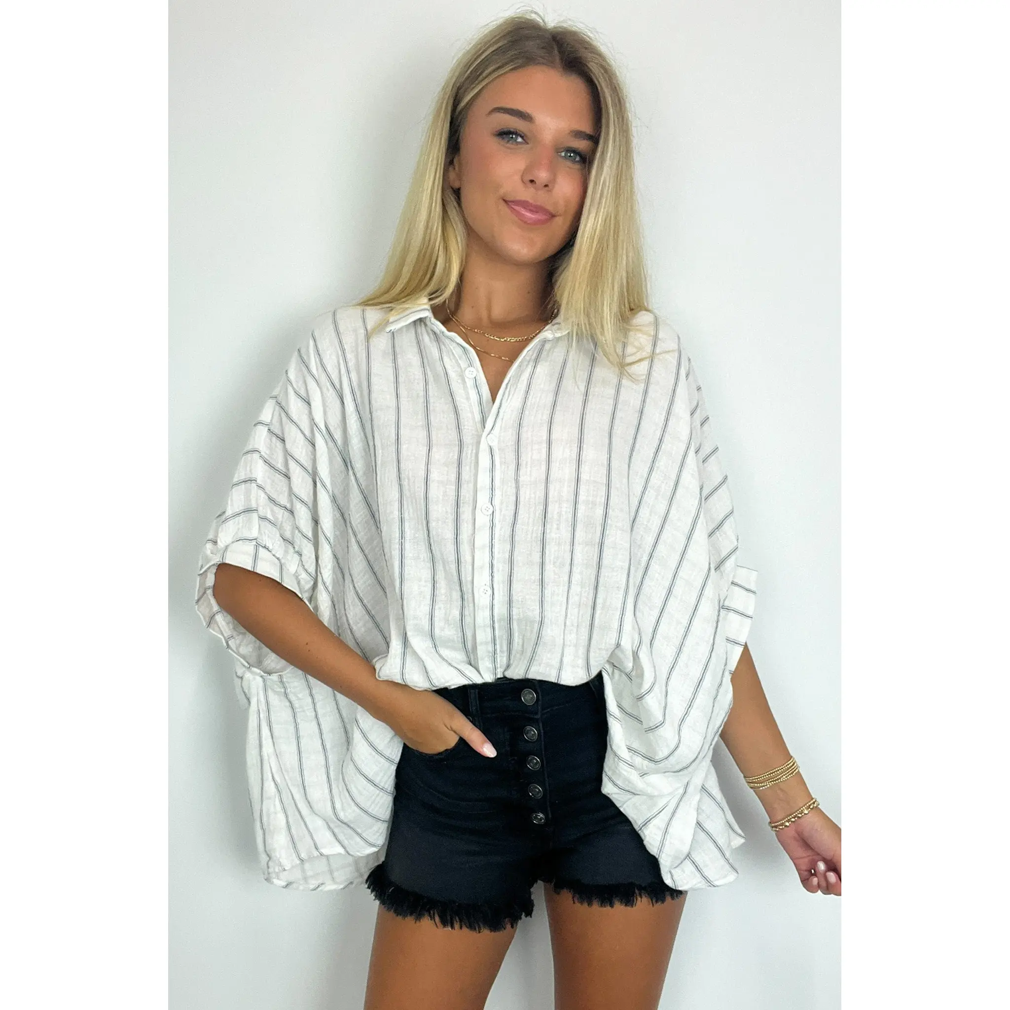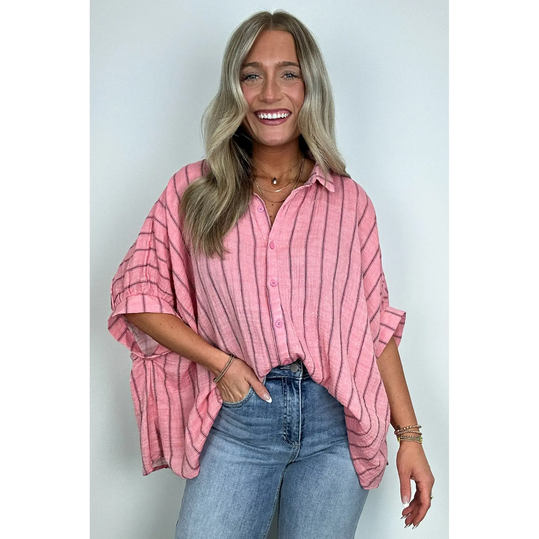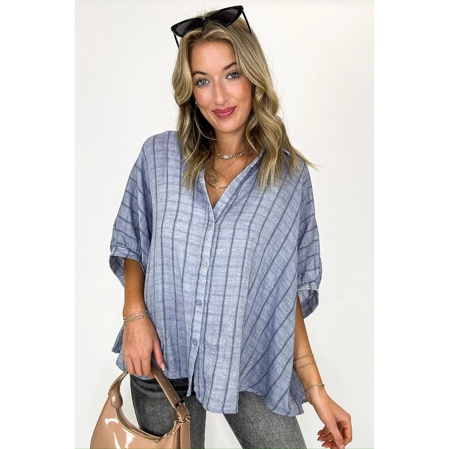 This is a great oversized dress up shirt. Love it with jeans or with palazzo pants to dress it up.