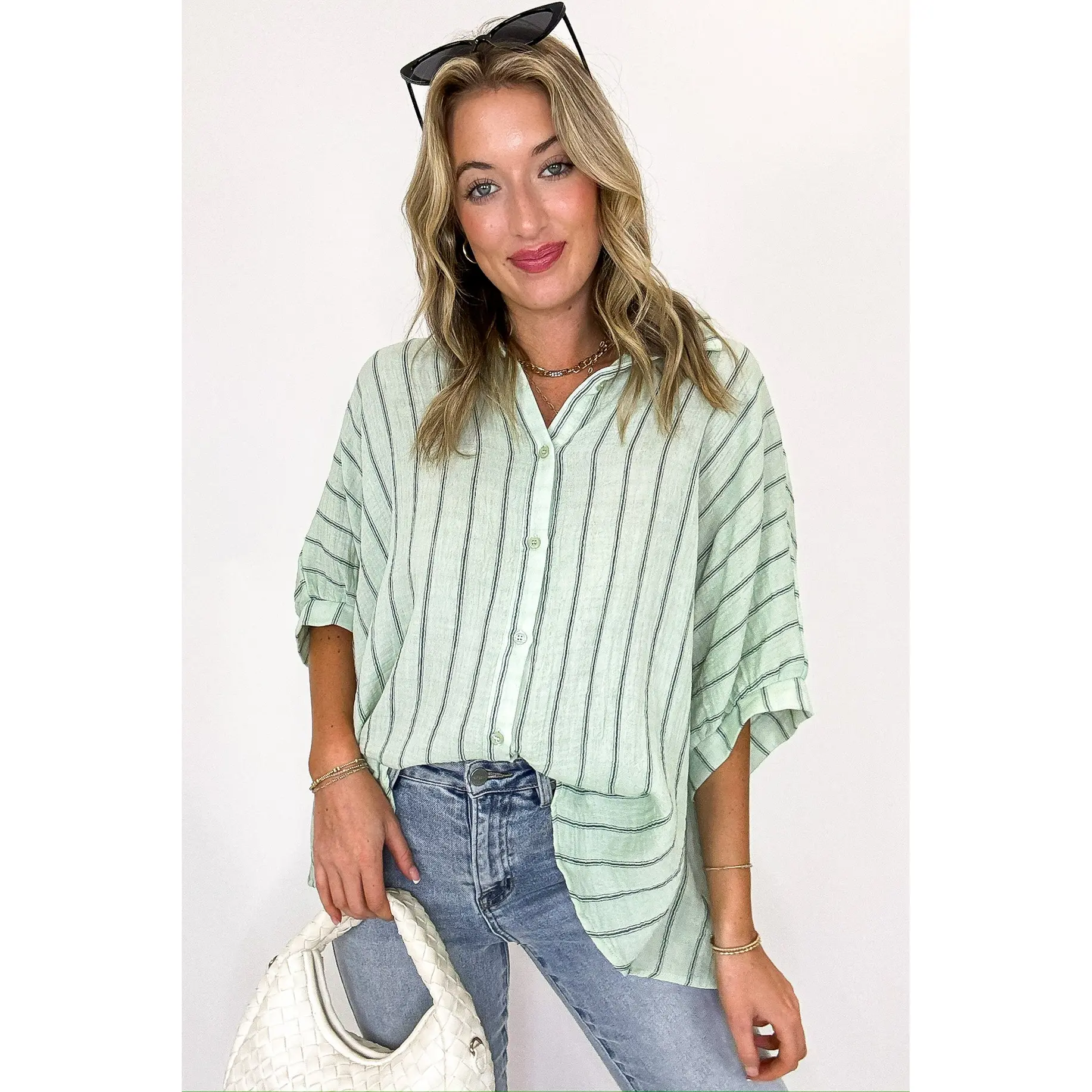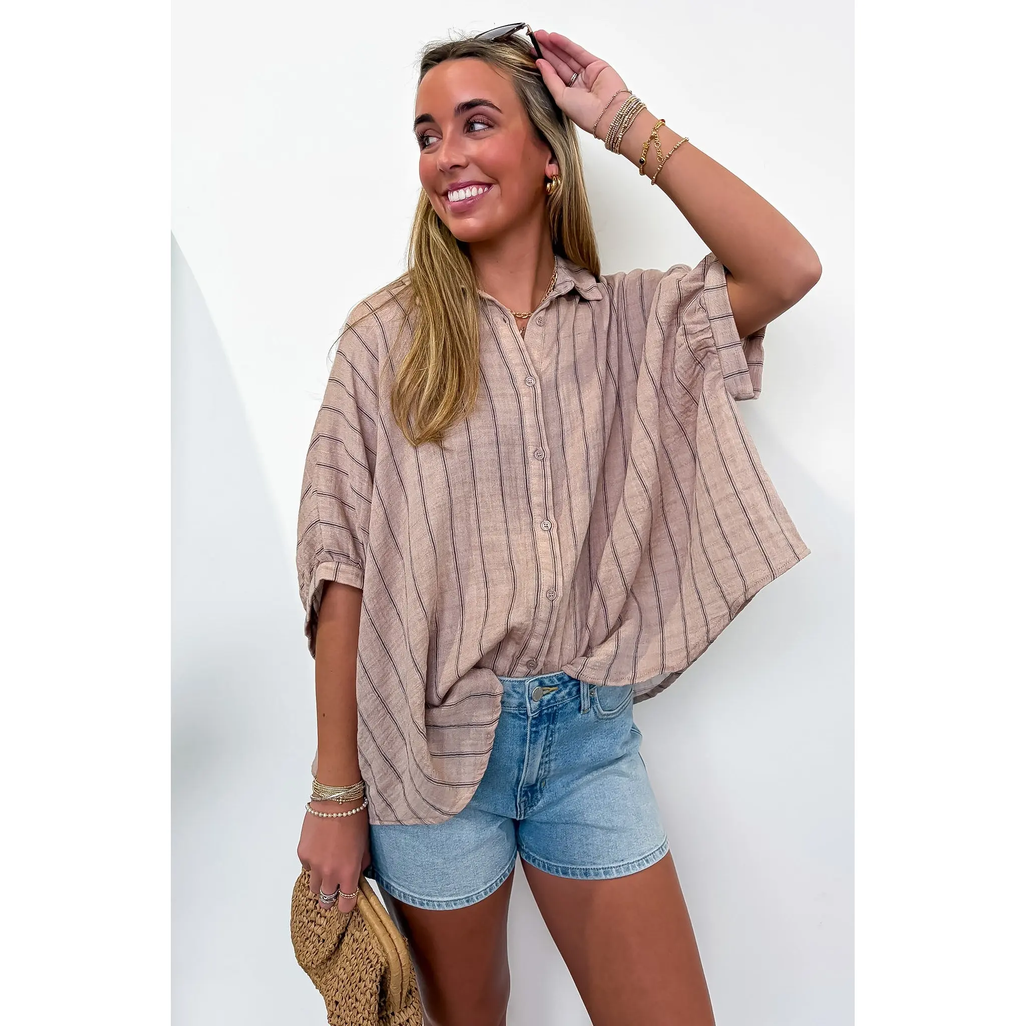 Super cutie top to transition from Spring to Summer. Can be dressed up or down. Great cut for a front tuck. Already ordering a 2nd color.