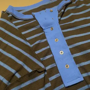 VERY cute, super stretchy, soft, thin (in a good way) falls nicely so it doesn’t seem frumpy. Only note; hate the inside-out seams on the buttons & (most of) the hems. Sleeve cuffs are sewn correctly, all others are inside out (I think intentionally) and it looks unfinished