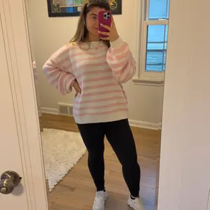 i love love love this sweater! it is perfectly oversized, i personally wouldn’t size down, i would get your normal size. it is super cute with jeans but also cute dressed down with leggings. i love the material of this sweater! overall, i definitely recommend!