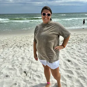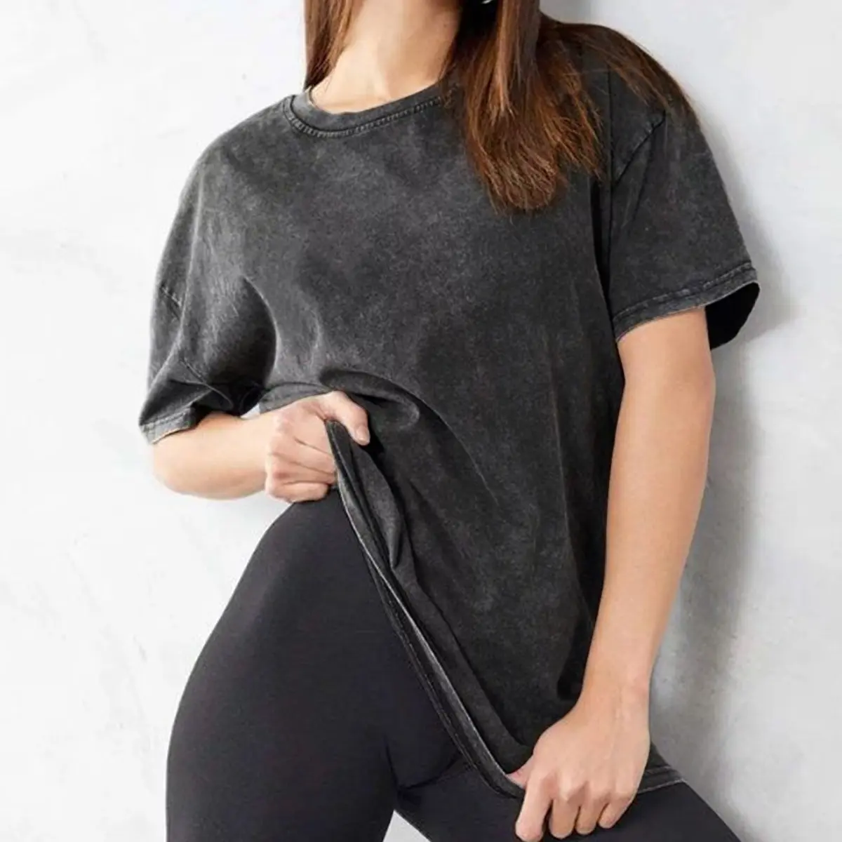 Love these shirts. The color is perfect. Very comfortable brand. Comfort color brand is great. And the wash well too. No shrinkage. Also love the sleeve length on these shirts. Great for hiding problem areas for a lot of women. I’m 184lbs, 38F cup and I wear a Lg.