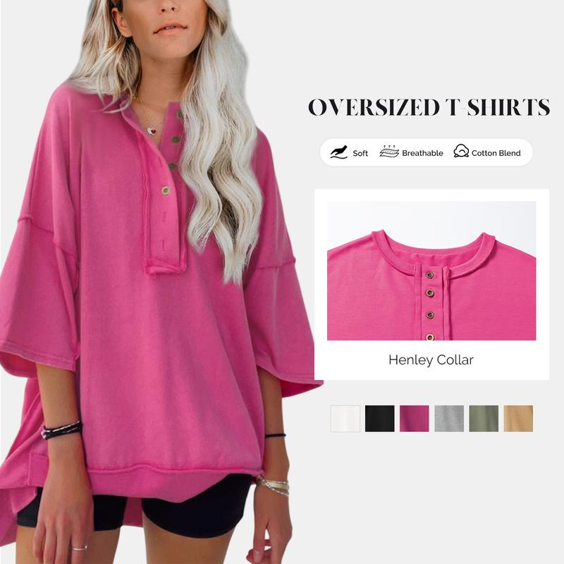 Oversized t-shirts feature a classic henley collar design. Solid color, short sleeve tees with a button-down v-neck add a chic look. Ribbed hem enhances the comfortable fit. This unique design offers a stylish appearance, perfect for casual outings. Pair it effortlessly with jeans or leggings.