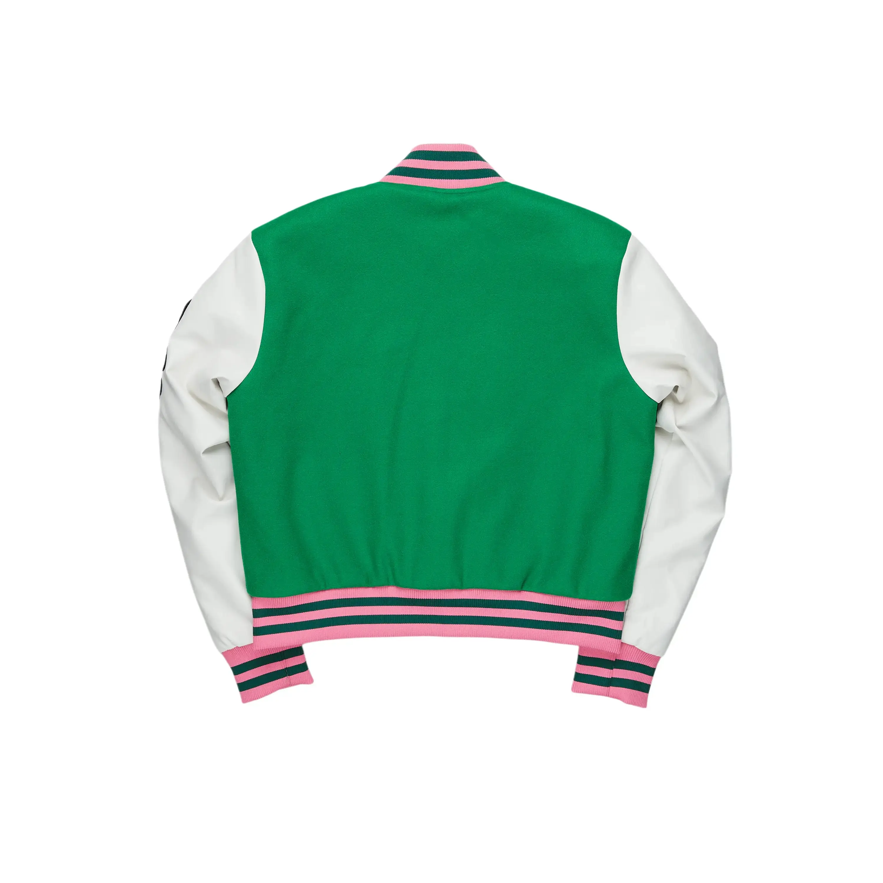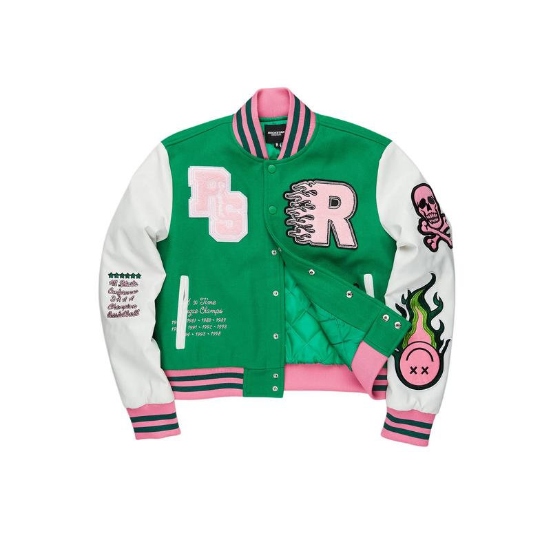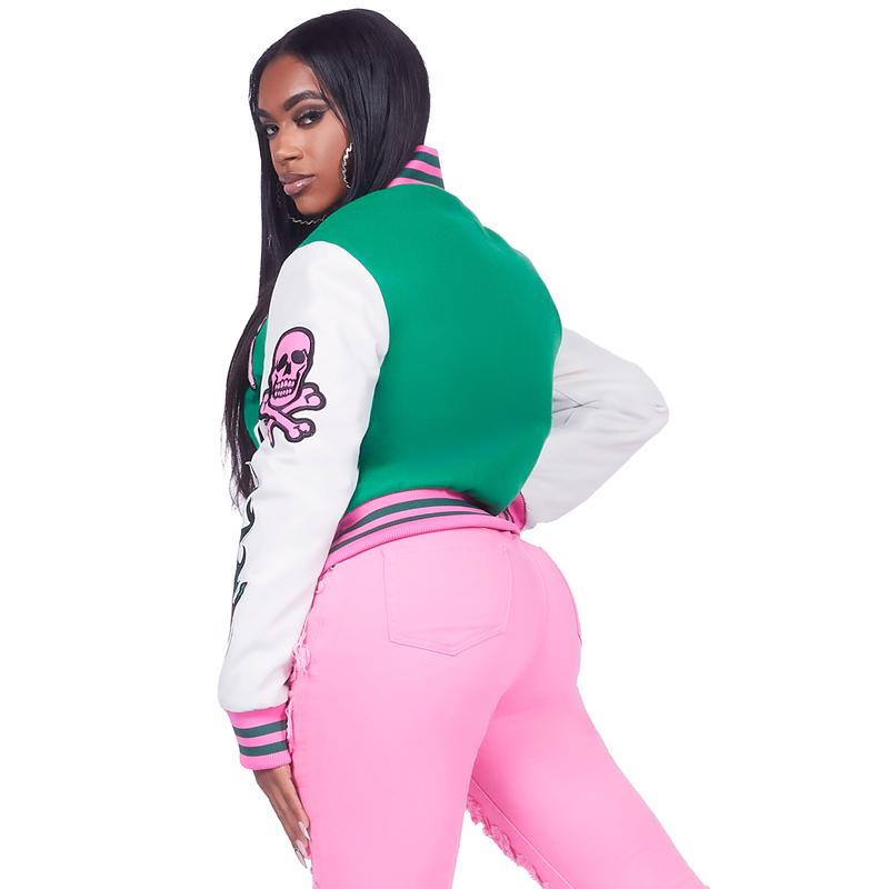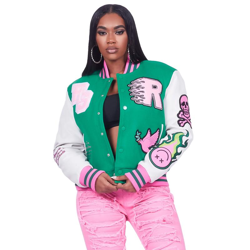 An urban collegiate varsity jacket for women in green. Designed with an ultra soft fleece body and contrast faux leather sleevesΒ for a stunning outerwear style.