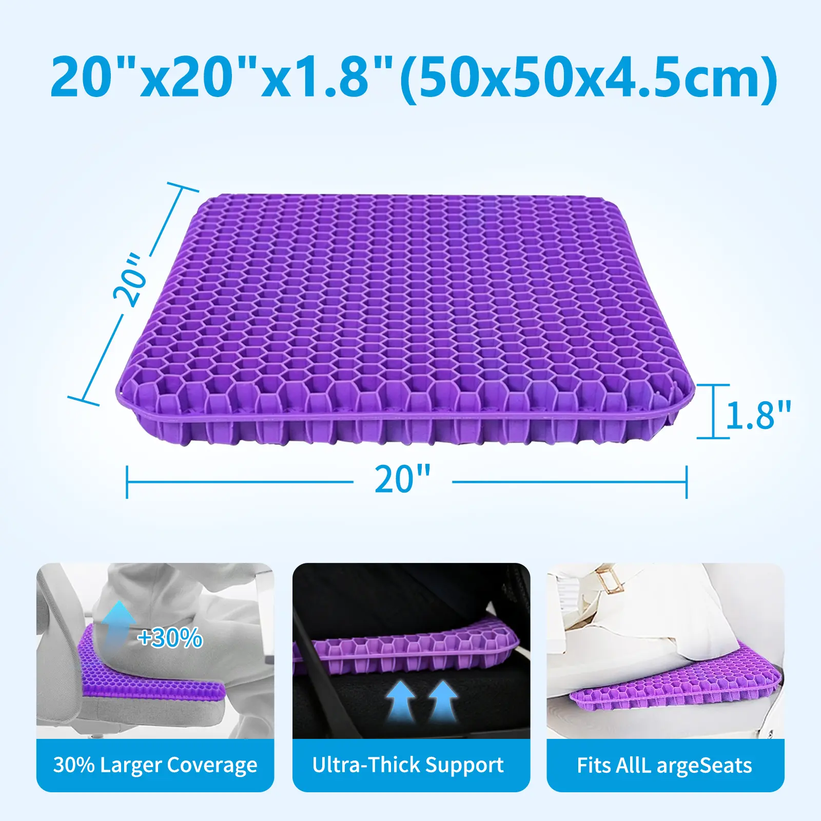 ·TRUE OVERSIZED XXL COVERAGE Measuring 20" x 20" (50x50cm), this XXL cushion offers 40% more surface area than standard pads. It’s specifically designed to fit large office chairs and truck seats perfectly without sliding.