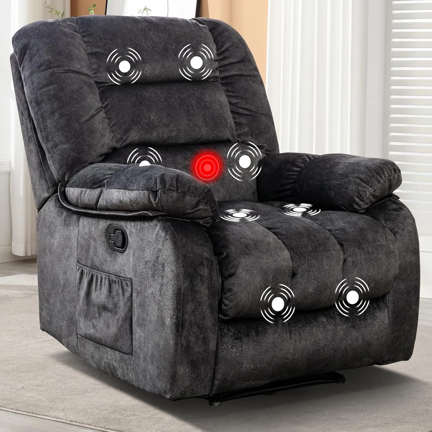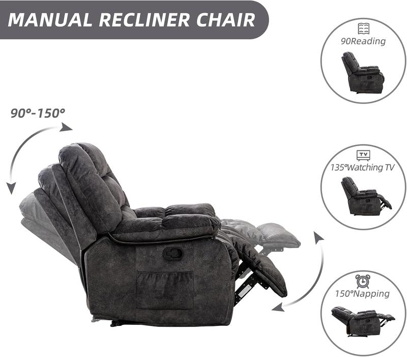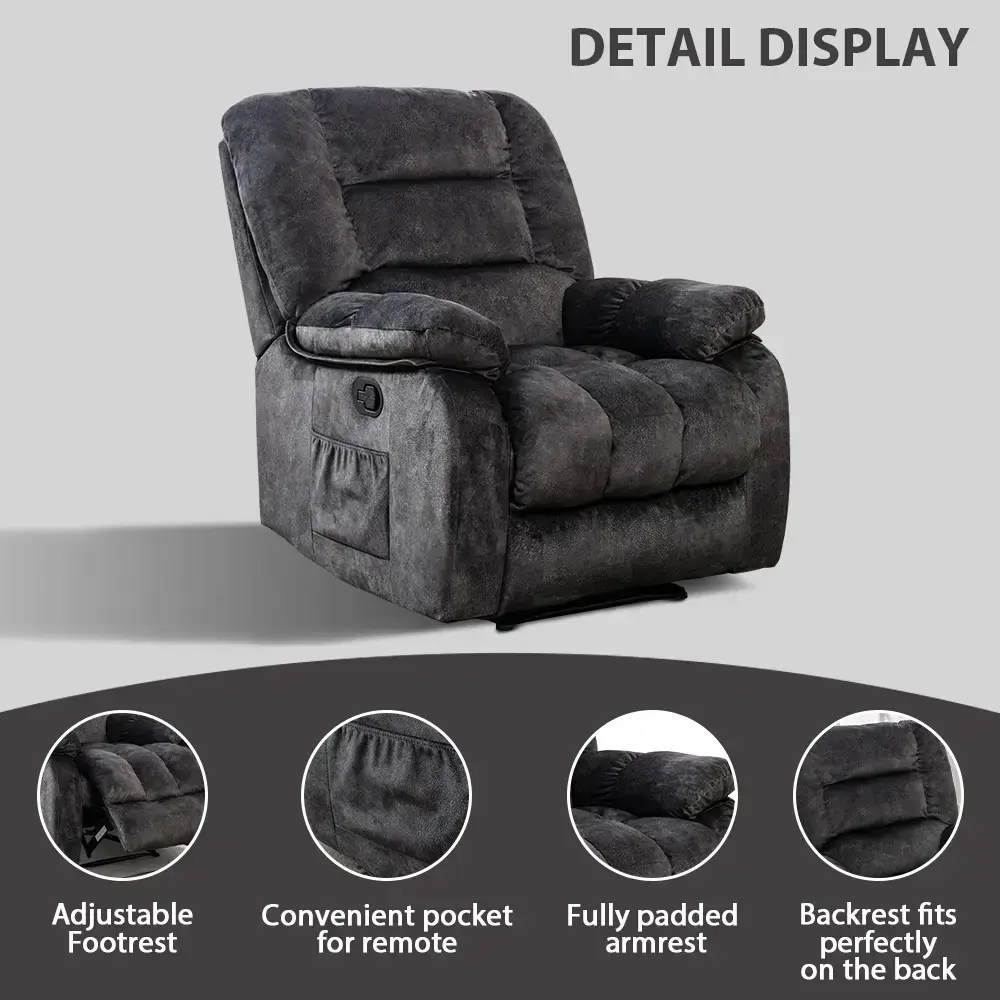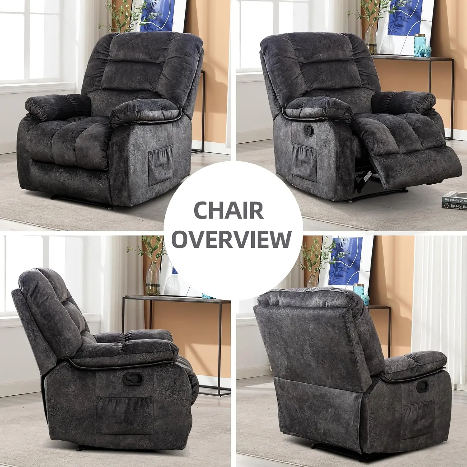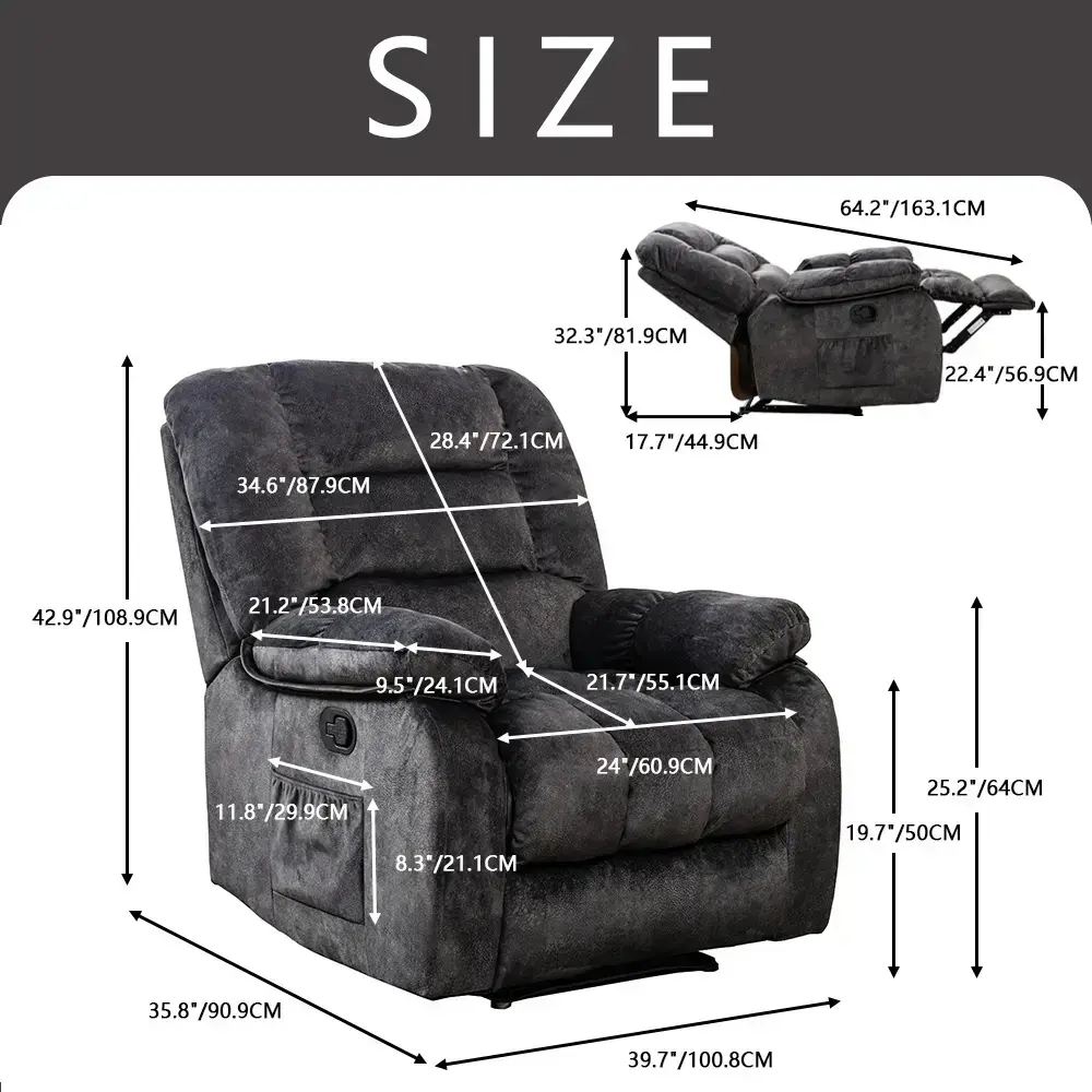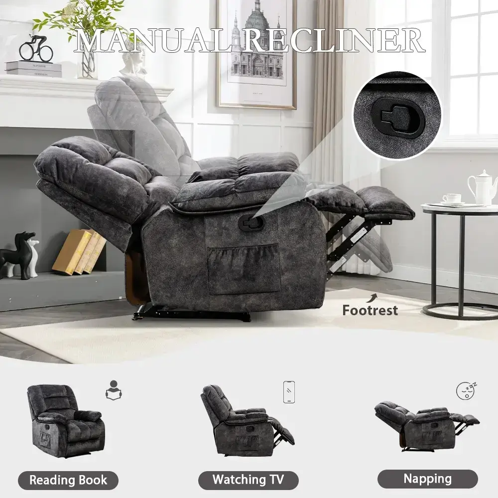 Vibration Massage & Heat: This overstuffed recliner for living room comes equipped with a vibration massage function that targets key pressure points to help relieve tension and stress. The added heat feature enhances your relaxation, providing soothing warmth to your back