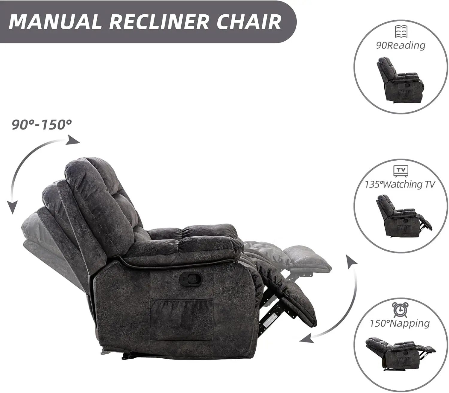 Manual Reclining Function: With a smooth manual reclining mechanism, you can easily adjust the chair to your preferred angle. The handle lever makes transitioning between upright and reclined positions effortless