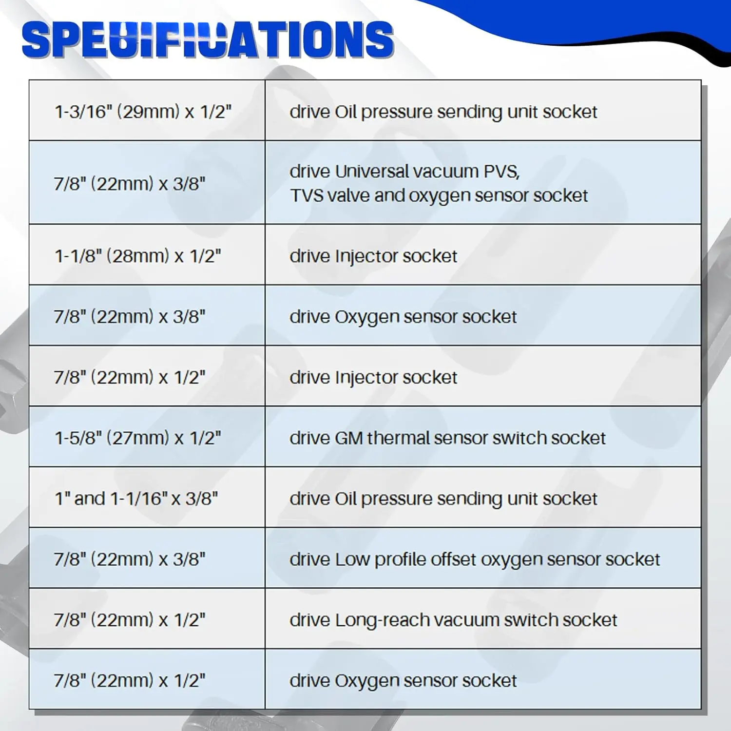 Function: Sockets O2 Sensor Tool Set lets you quickly and easily remove oxygen sensors, oil pressure sending unit, fuel injectors, and vacuum switches.