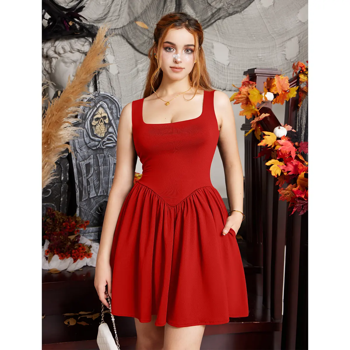 ·Features: Sleeveless, square collar, mini length, A-frame ruffled hem, double side pocket design, easy to install key bank card when going out, there is A strap design at the back, which can tighten your waist and highlight the charming waist line