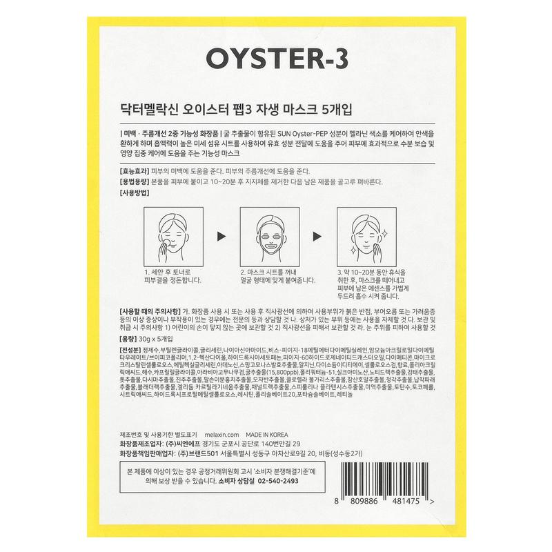 Dr.Melaxin Oyster Pep-3 Renewal Beauty Mask Pack, 5 Sheets, 1.05 fl oz (30 g) Each