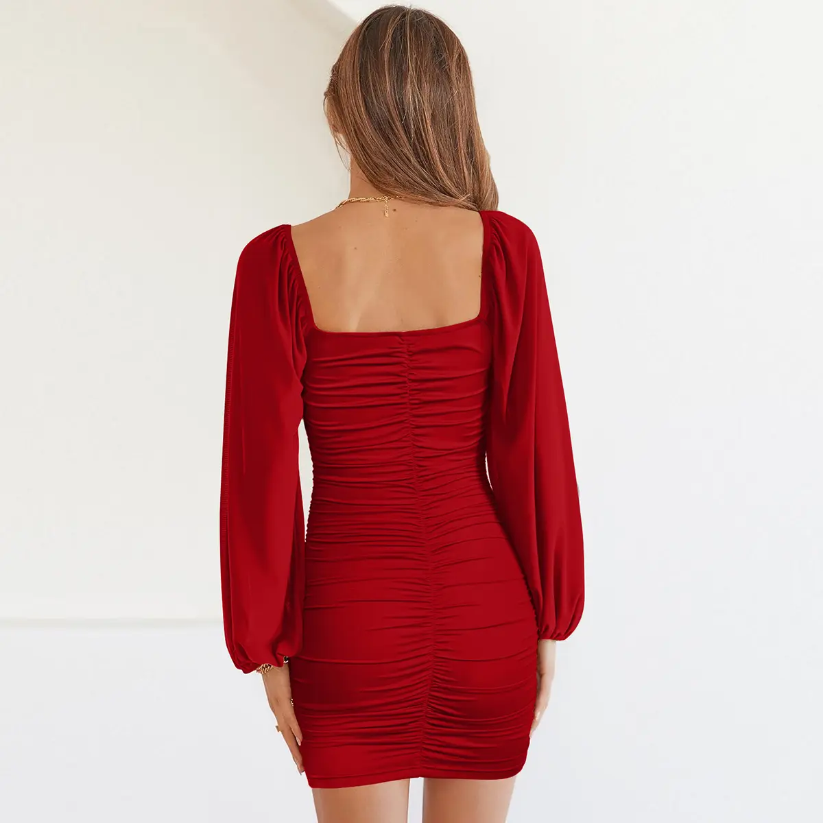 ·Design: Solid color, lantern long sleeves, square neck, slim fit, ruched details, mini length.