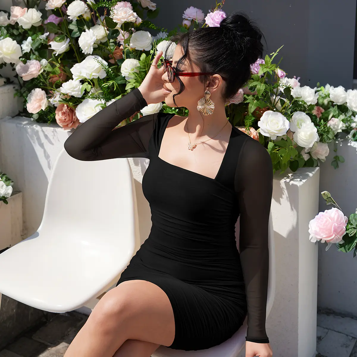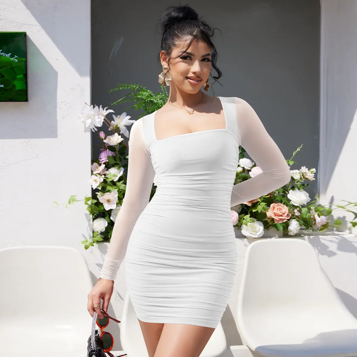·Features a square neck design, mesh sheer back and sleeves, and a ruched bodycon fit. Perfect for semi-formal occasions. 🎨