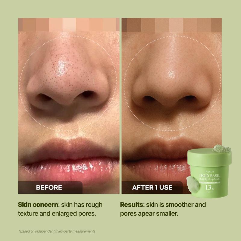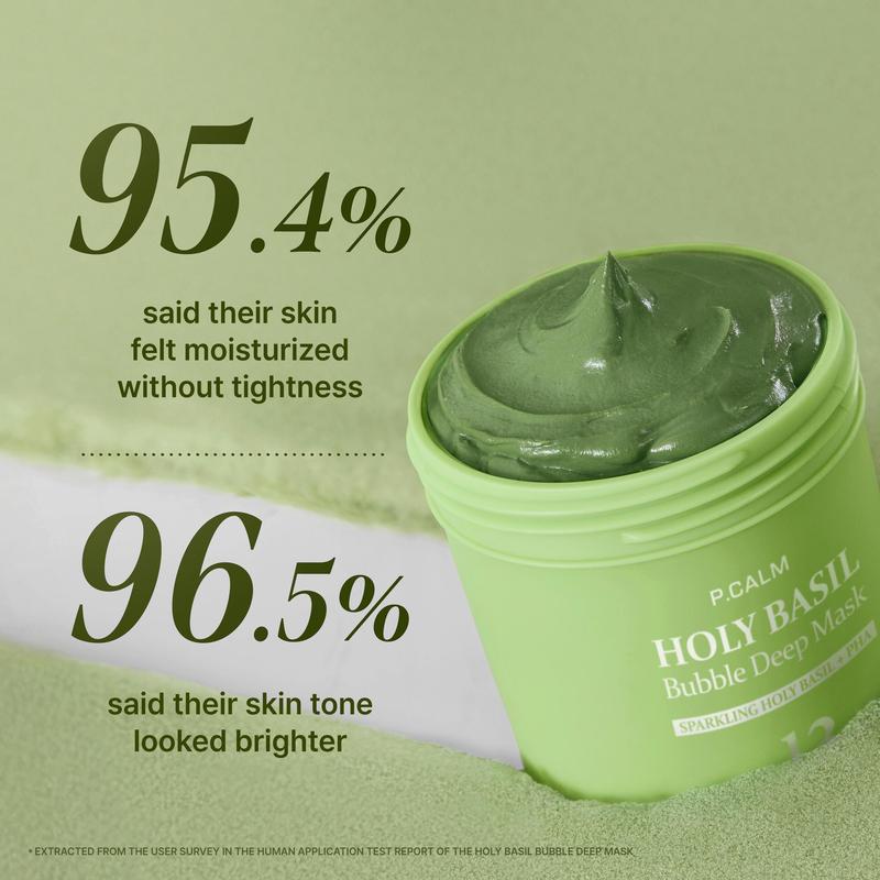 The P.CALM Holy Basil Bubble Deep Mask harnesses Holy Basil & Carbonated Water for effective pore cleansing and blackhead removal. This Korean Clay to Bubble Wash-Off Pack weighs 90g/3.17 oz. It includes extra space for carbonation, ensuring stability and effectiveness. Each jar contains the full 90g as labeled. Perfect for maintaining clear pores and skin health.
