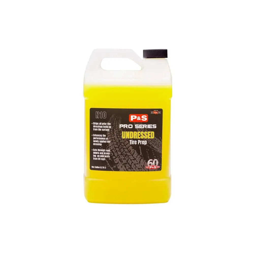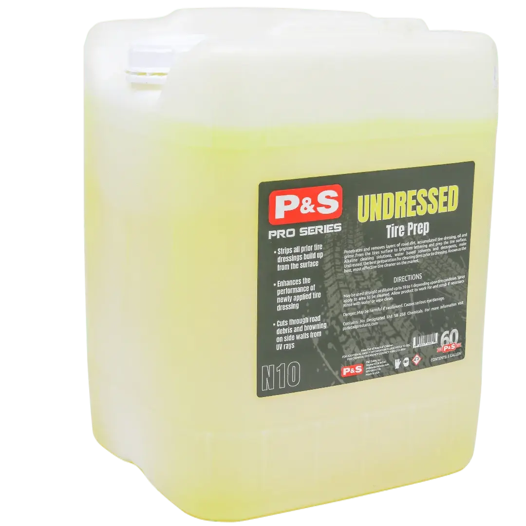 P&S Undressed is an auto tire cleaner that penetrates and removes layers of road dirt, oil, and grime from the tire's surface. It is designed to brighten raised white lettering and whitewalls and is known as one of the most effective tire cleaners on the market. The alkaline cleaning solutions, water-based solvents, and detergents in Undressed make it the best choice for preparing tires for dressing. Simply apply the product to the tires, allow it to penetrate and remove dirt and grime, and then rinse it off to reveal a clean, bright surface. Whether you are preparing your tires for dressing or simply want to keep them clean, P&S Undressed Tire Prep is an excellent choice.