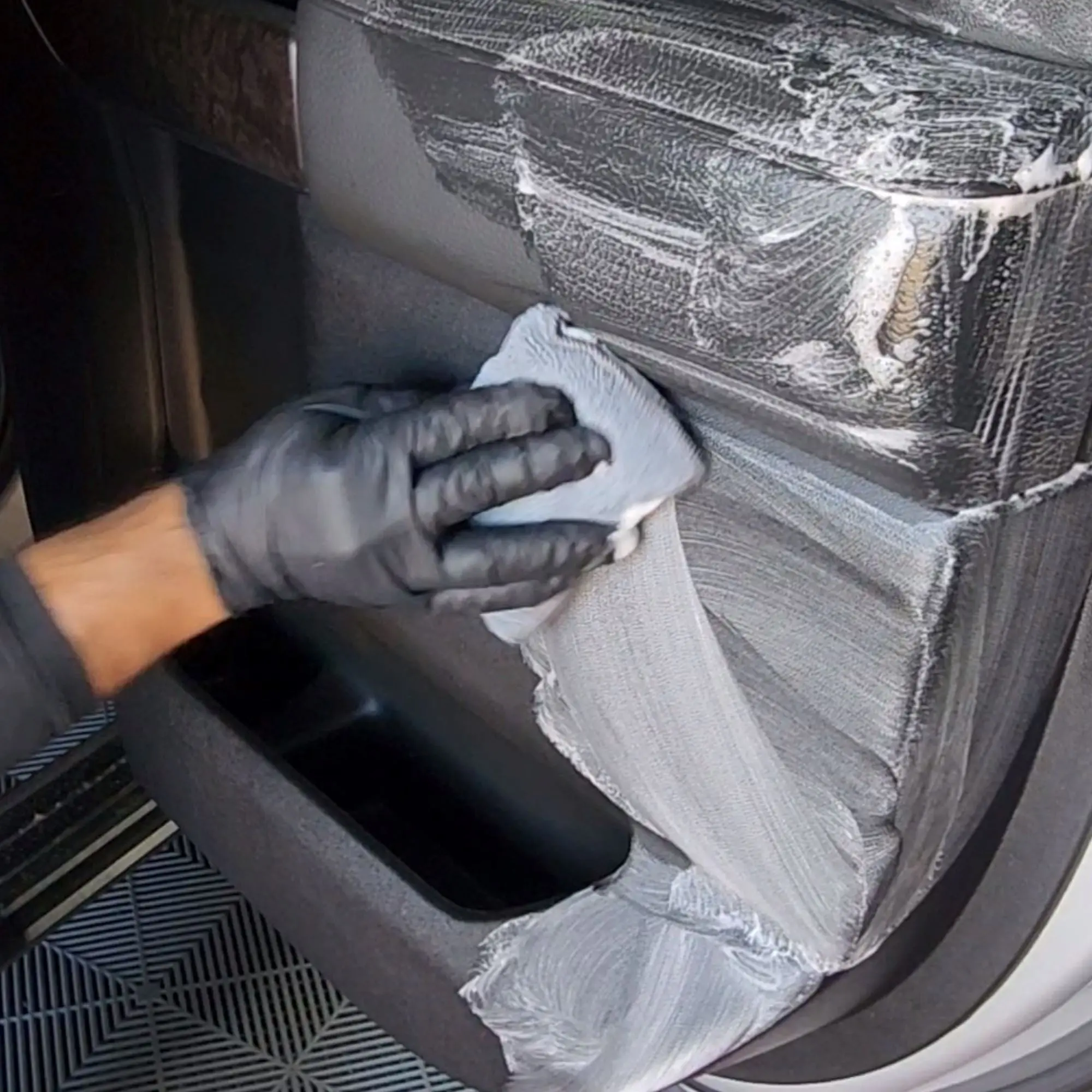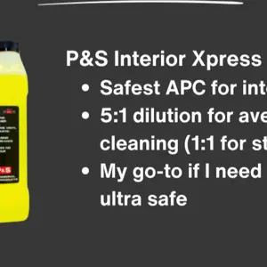 While P&S Xpress Interior Cleaner is known for its safety, it's advisable to perform a preliminary test in an inconspicuous area of your interior to confirm its compatibility with your surface. You have the option to use P&S Xpress Interior Cleaner undiluted or mix it in a 1-to-1 ratio with water, depending on your preference. Apply the cleaner to the surface until it foams, and then proceed to gently clean the area using a cloth, soft brush, scuff pad, magic eraser, or your preferred cleaning tool. After cleaning, wipe the surface with a damp towel.