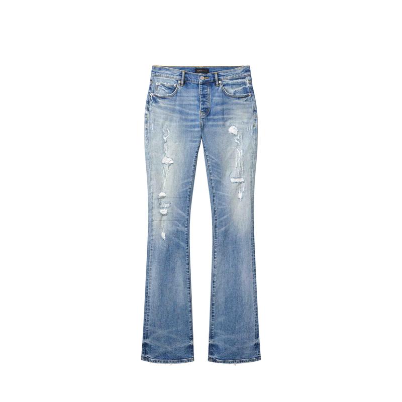 Our P072 is a low-rise men’s jean, crafted from premium stretch denim with classic five-pocket construction that includes a button-fly closure and reinforced belt loops as well as hidden rivets and an inner lining on the back pockets for durability. It’s cut slim through the thigh with an extra-long flared hem and comes in a light indigo wash, with rip-and-repair distressing. A custom Purple cowhide leather patch, a back pocket flasher and a logo hangtag lend signature branded finishes.