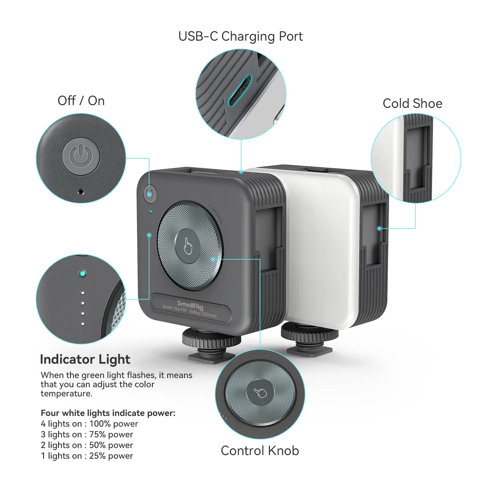 ·【2200mAh Large Capacity Battery】The SmallRig mini LED camera lighting is built-in with a 2200mAh rechargeable lithium battery that can be used continuously for about 105 minutes at maximum power. It is charged via the included USB Type-C charging cable, making it convenient to use on the go.