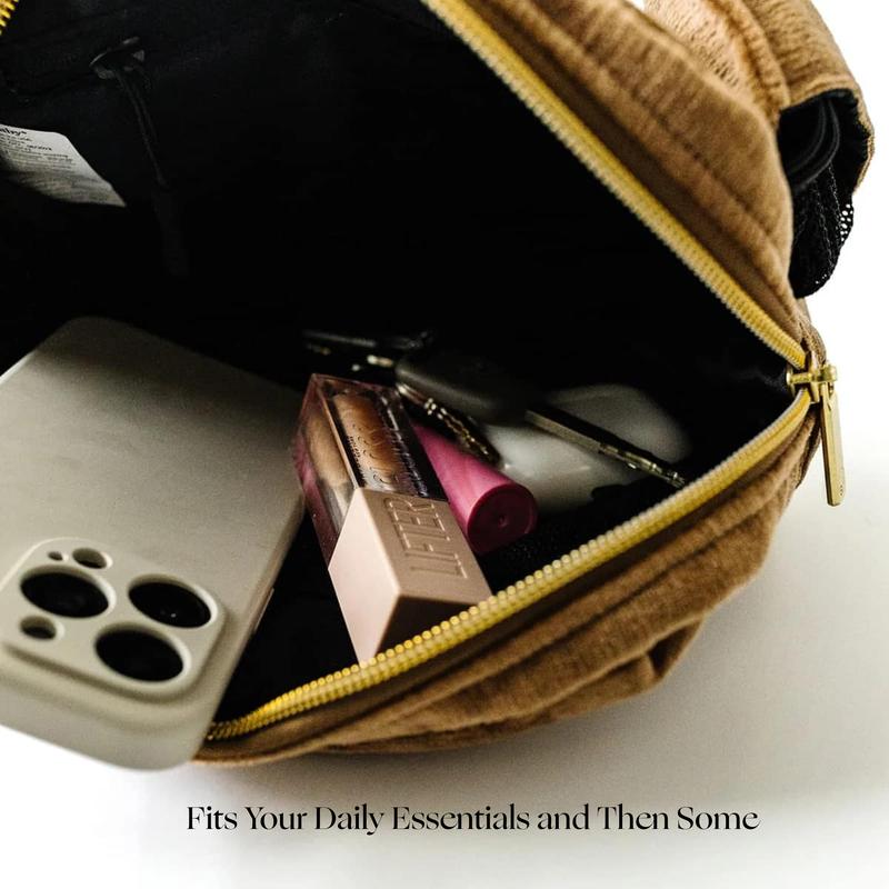 Not a bad item to have on hand for those quick runs to town. I can easily fit my travel wipes, 3 diapers, my wallet, lipgloss, phone, fob, an extra pen and my portable charger. The hidden water/bottle pouch is a nice feature to truly go hands free. Highly recommend if you’re trying to get to know this brand.