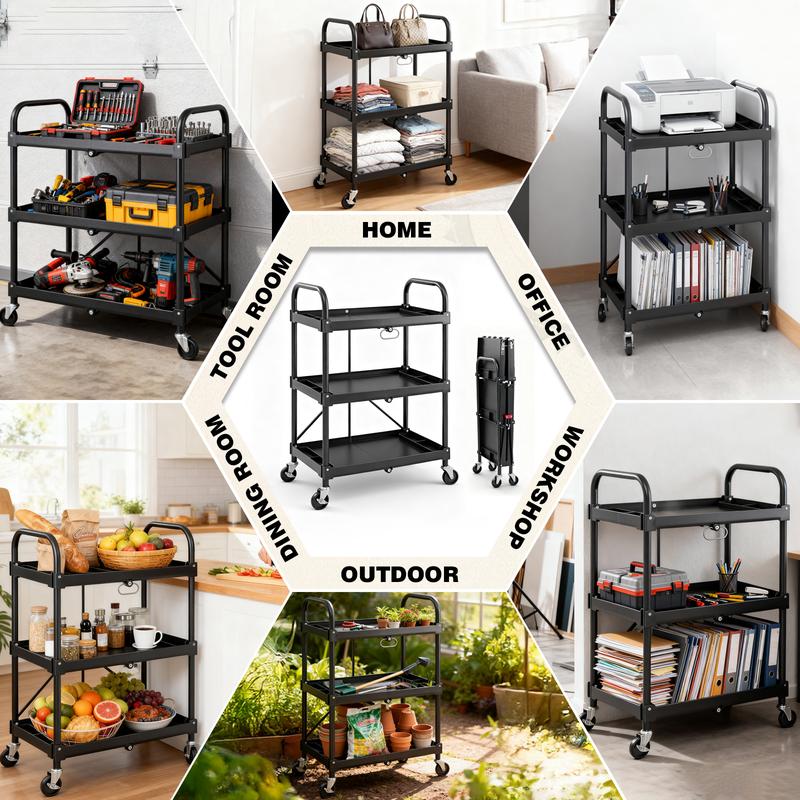 The cart has 3 collapsible shelves, providing plenty of space. It is made to last, suitable for home, garage, and industrial projects. With professional-grade quality, it easily repairs and fixes issues. The wheel color may vary between black or gray.