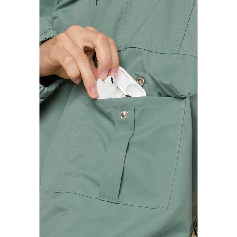 I’m accustomed to POPFLEX’s billowy, romantic sleeves but WOW these are REALLY big! Hits right at my waist and I love that I can wear it loose or scrunch it up for a different look. The Morning Moss color is absolutely gorgeous — such a unique shade. Haven’t had a chance to wear this out in windy conditions, but it definitely feels like it will block the wind— very high quality.
