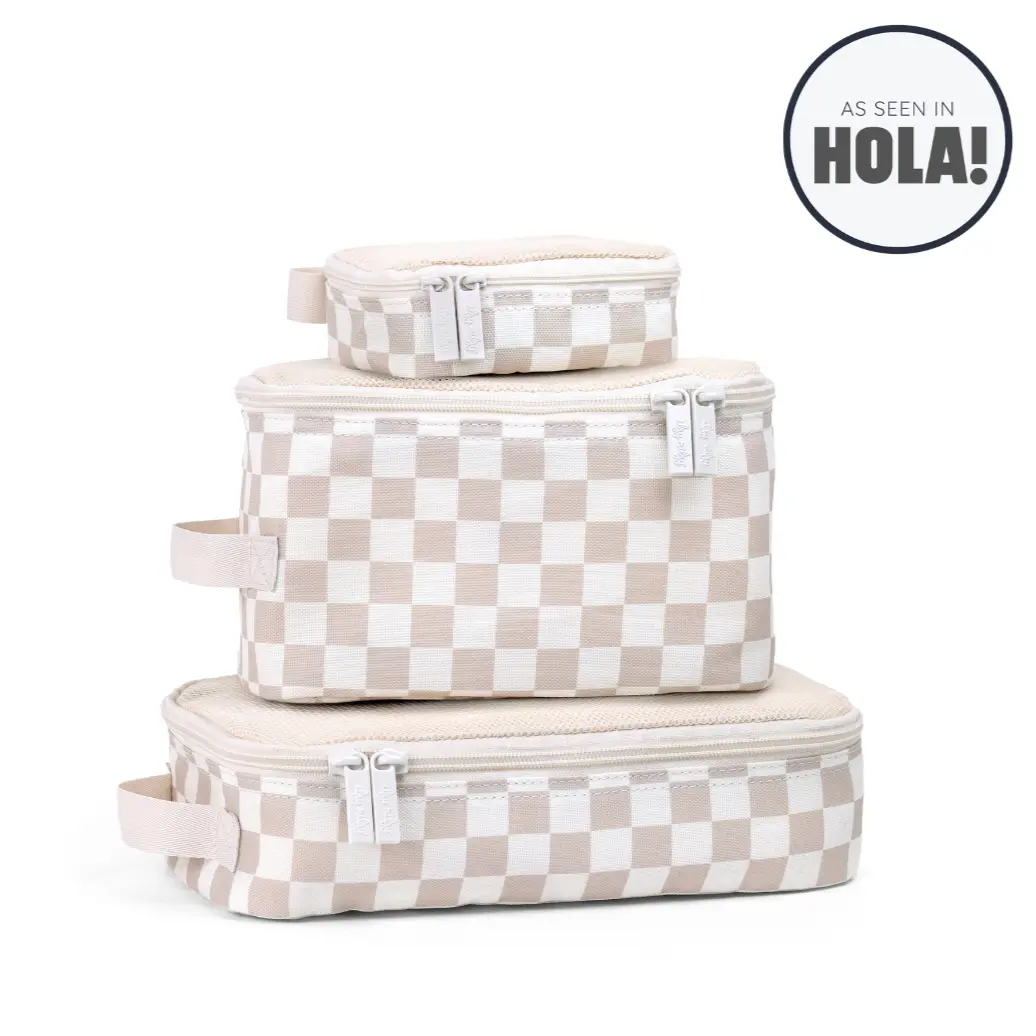 The cubes feature a chic checkered pattern, adding a touch of style to your packing solutions. Ideal for travel, life on the go, and everyday organization. The dimensions are: (Small) 4"L x 5.25"W x 2"H; (Medium) 8"L x 4"W x 4.5"H; (Large) 6"L x 10.5"W x 2.5"H.