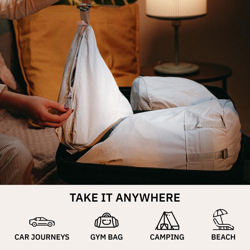 Our travel cubes come in two practical options to meet your needs. The 3-pack, ideal for shorter trips, includes one large (15L), one medium (10L), and one small (5L) pod, plus a carry strap. For longer journeys, the 5-pack provides extra storage with two large (15L), two medium (10L), one small (5L) pod, and a carry strap for convenience.