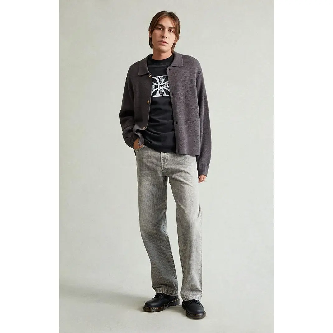 Experience laid-back comfort with Pacsun's Dylan Baggy Jeans Tonal Stripe Gray. These jeans feature a zip fly closure and a gray wash. Crafted from textured rigid fabrication, they offer a wide leg and a five-pocket body, combining durability with casual style for everyday wear.