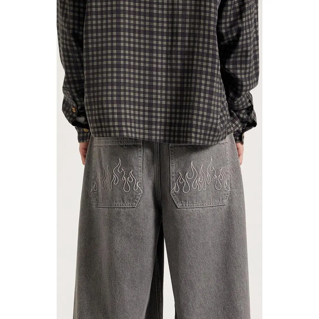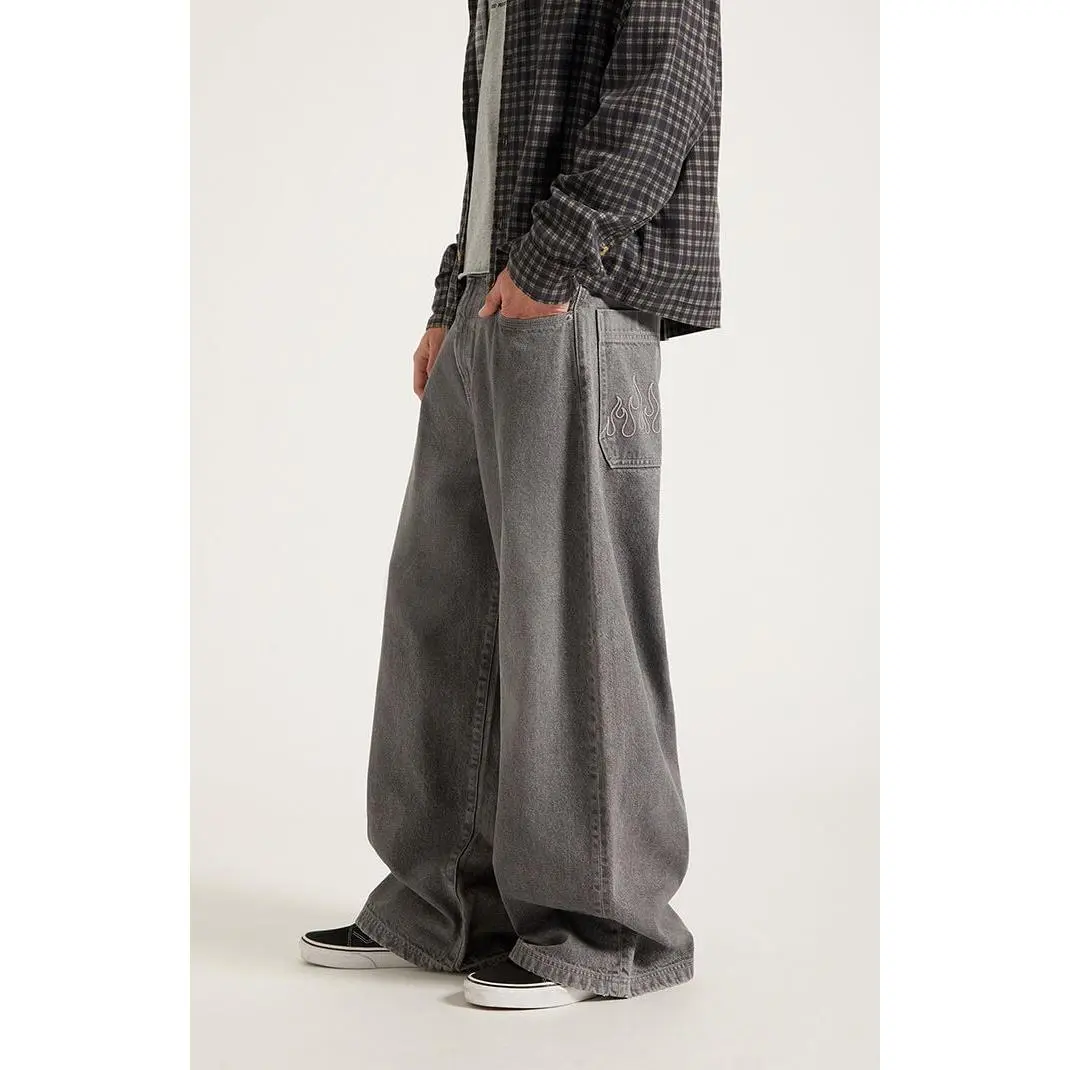 The Ryder Ultra Baggy Jeans Flames Gray from Pacsun delivers bold style with a trendy edge. Featuring a gray wash, these jeans are crafted from rigid fabric with a baggy fit from the thigh through the knee and extra-wide legs for a relaxed, statement-making look along with flame embroidery on the back pockets making them a stylish addition to your wardrobe.