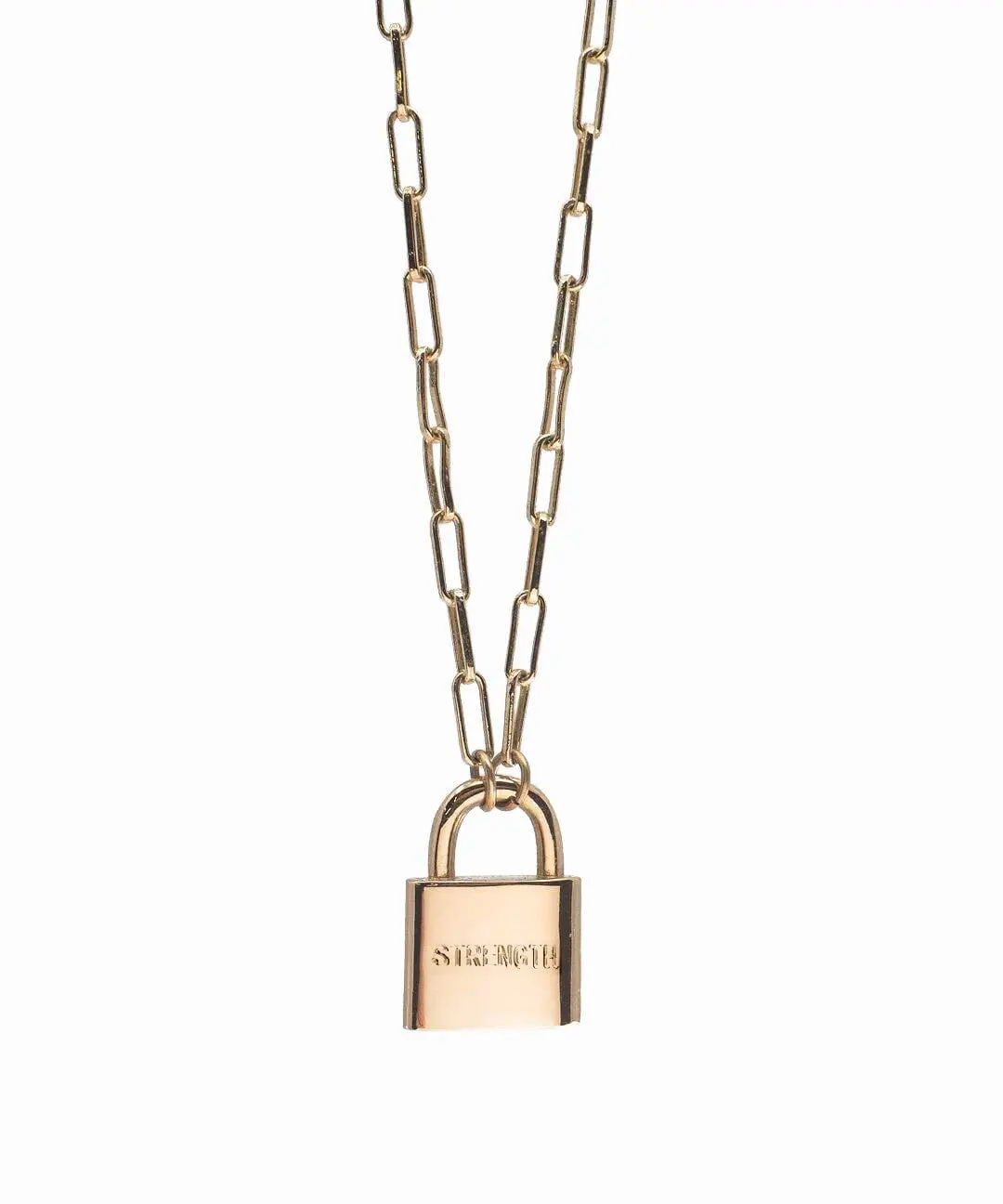 ·16" length with a 2" extender length with a Gold Padlock stamped with FEARLESS or a Silver Padlock stamped with STRENGTH