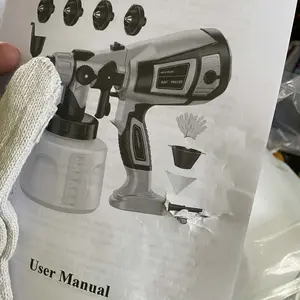 ·Paint sprayer tool:What you will get:a paint sprayer,a large capacity container,gloves,four copper nozzles (one pre-fitted),three paper funnels,a filter,a viscosity cup,a cleaning needle,a cleaning brush,and a user manual