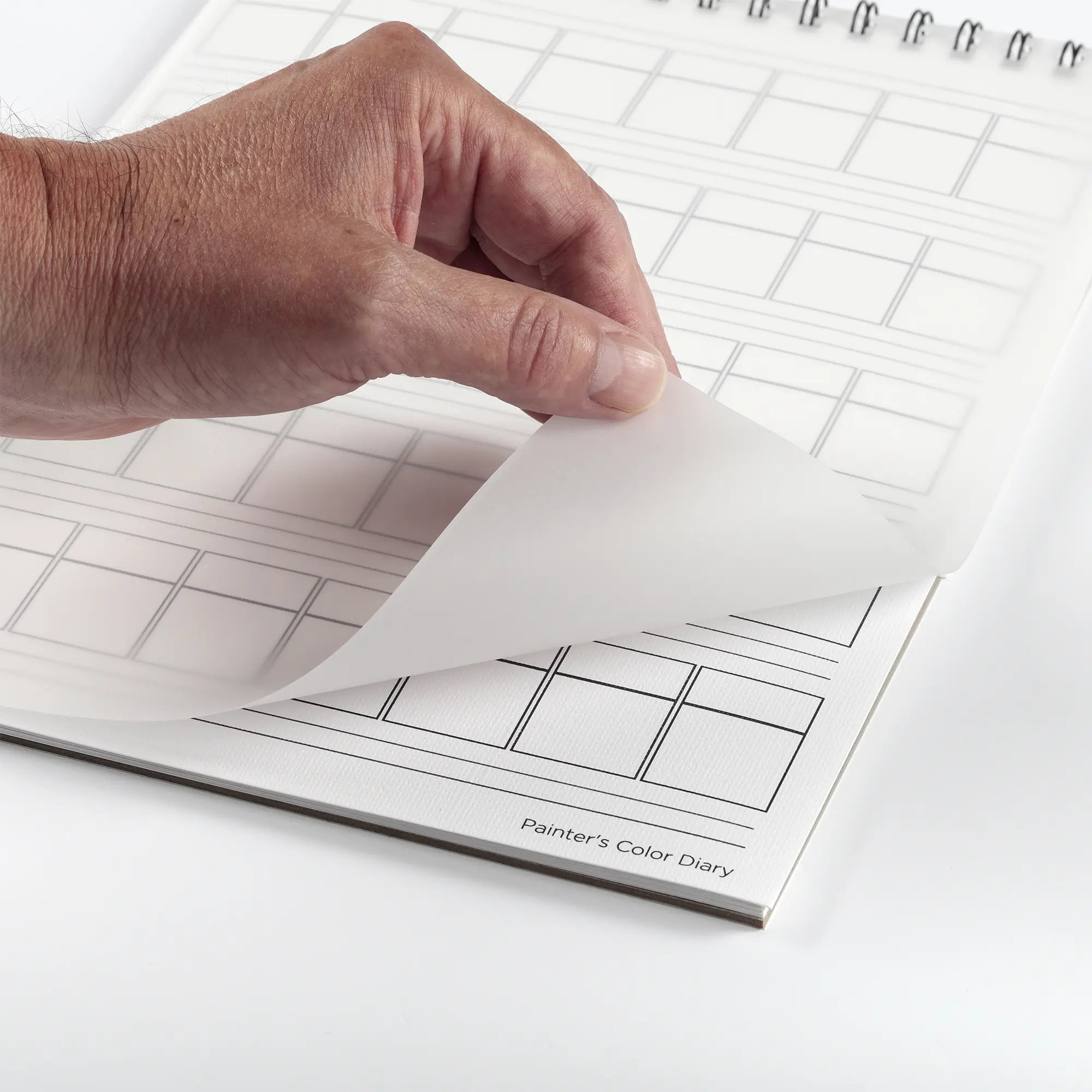 The diary is spiral-bound and acid-free, with specially designed pages that can be removed from the spine for easy use. Stack different removed pages to create paint swatch cards for color theory! Once completely dry, you can reinsert the pages into the diary. Each page will remain protected by the glassine interleaving sheets, which prevent your color charts from sticking together. Another bonus is the ability to pull out an individual color chart when you need to refer back to particular colors. Each sheet is 9x12 inches from the perforated edge, with ample room for notes and descriptions. The top of each color chart has a line for writing the paint brand, date, your name, or an assignment title if it's for a class. The diary page layout gives five rows of 8 rectangles, separated by two lines for notes and labeling. Each rectangle swatch box measures 1" x 1.5" and has a bold black horizontal line halfway from the top. This deliberate line is there to show transparency or separate half-tones for each color. Creating a color diary collection provides you with intimate knowledge of how each color performs, from a glaze to a mass tone. As a painter, you know how valuable swatch and color mixing Information is. Think how much easier it will be to plan your paintings with all that critical Information in an organized format! The Painter's Color Diary is exclusive to Jerry's Artarama and is essential for every painter seeking to improve their color skills. We recommend this color diary to any artist who wants to enhance their understanding of color, mixing, tinting, and shading.